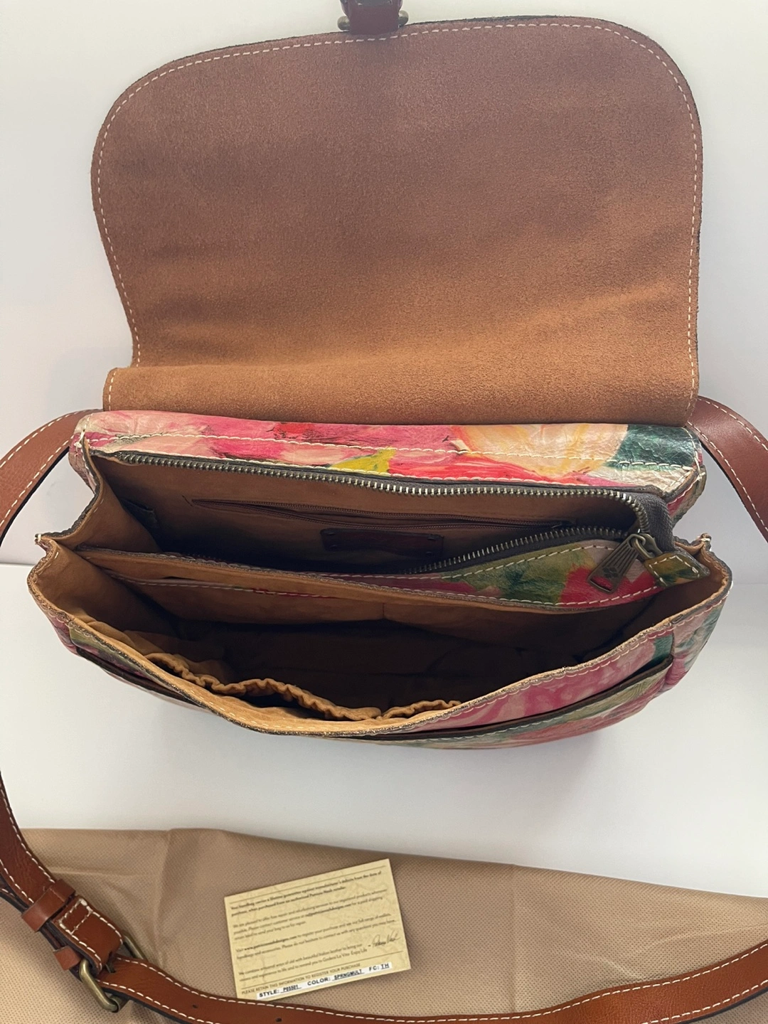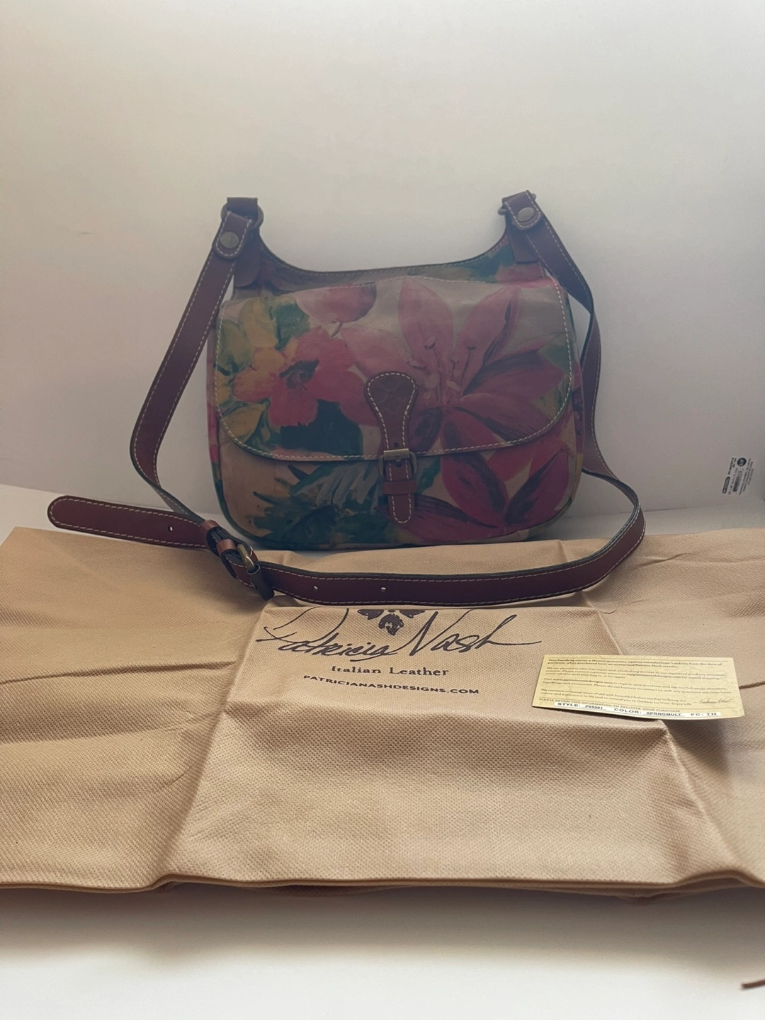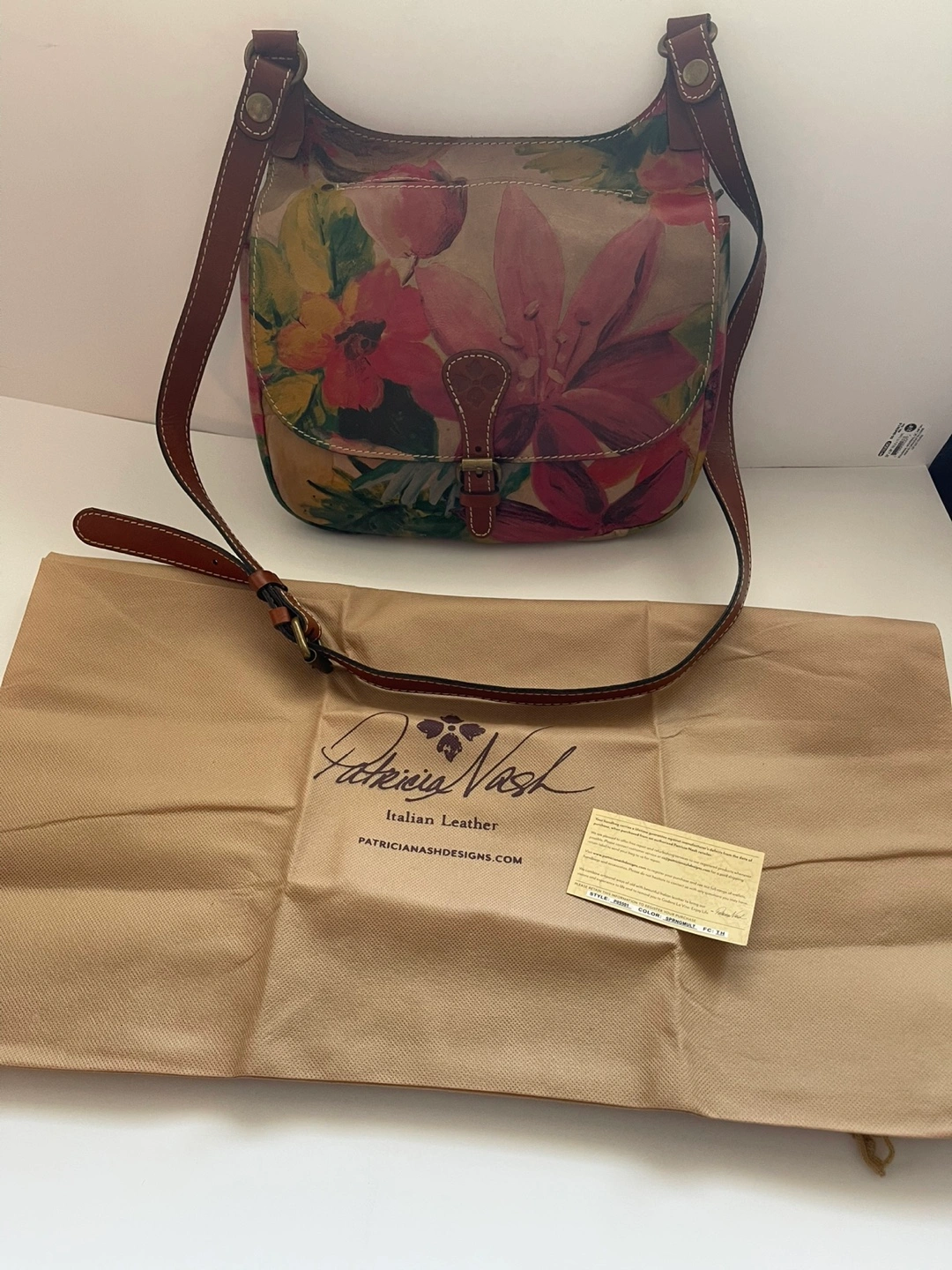 This Patricia Nash shoulder bag features a beautiful floral design on Italian leather, perfect for adding a touch of elegance to your outfit. The bag comes with its original dust bag, ensuring it stays protected when not in use. It's a stylish and functional accessory!