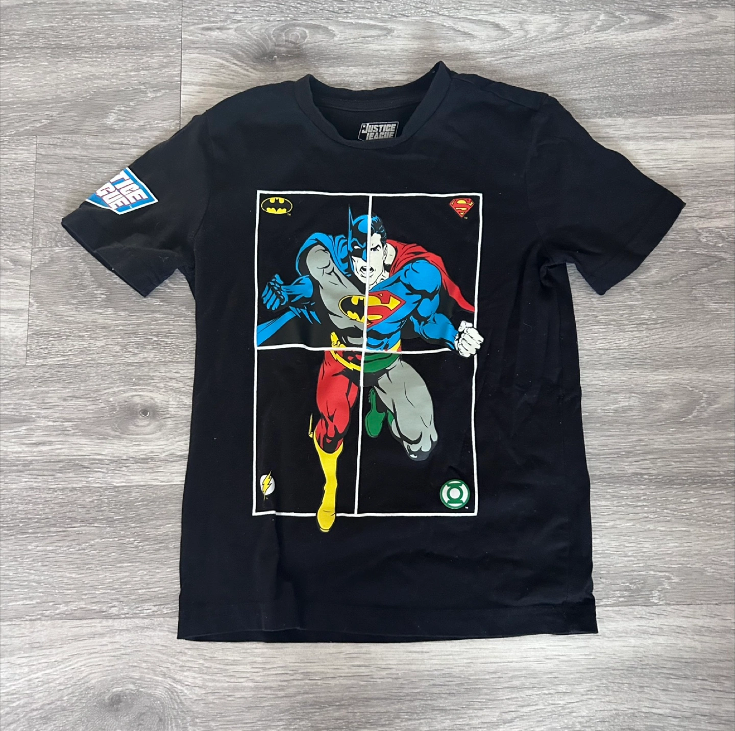 36Cool Justice League graphic tee for kids! This black t-shirt features a unique design with Batman and Superman. It's made from a blend of 60% cotton and 40% polyester, making it comfy and easy to care for. Size is S/P/C (6).