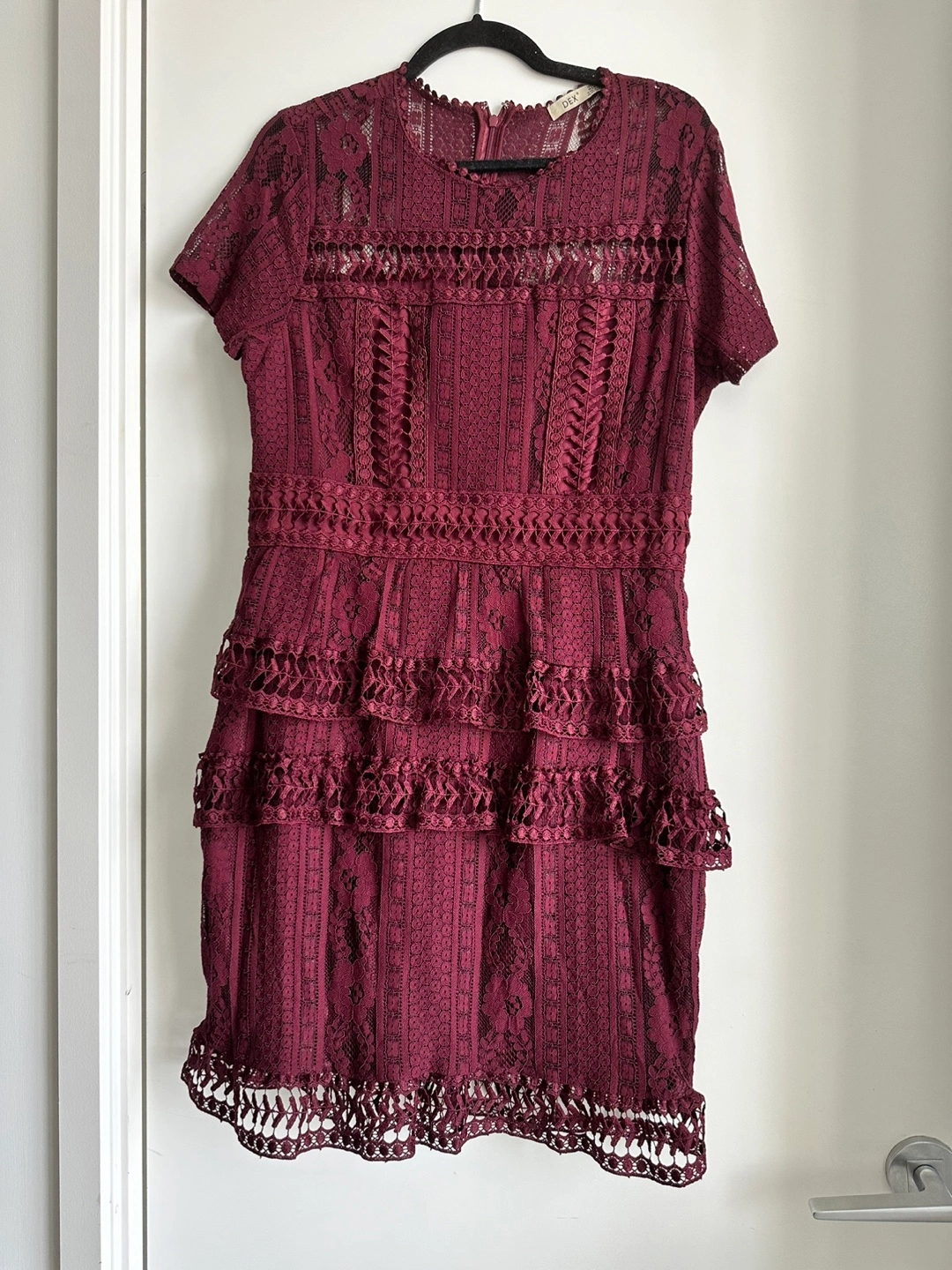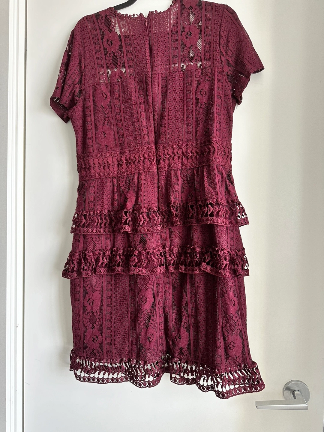 Selling a beautiful burgundy lace dress in size 12. It's in great condition and features a tiered design with intricate lace detailing. Perfect for a special occasion!