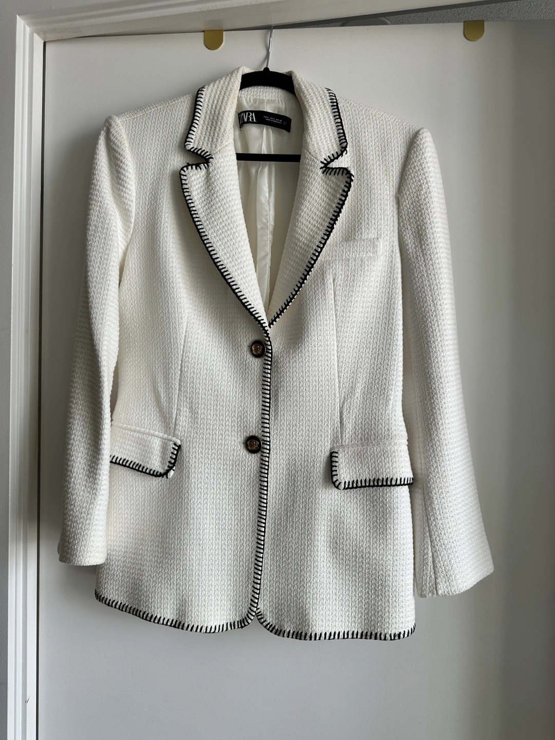 Selling a cute Zara white tweed blazer. It's a size L and made of 100% acetate. Perfect for adding a touch of class to any elegant outfit.