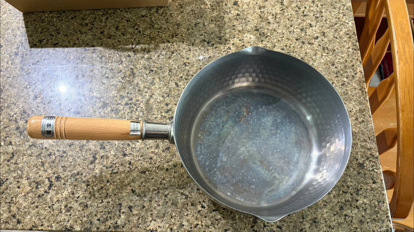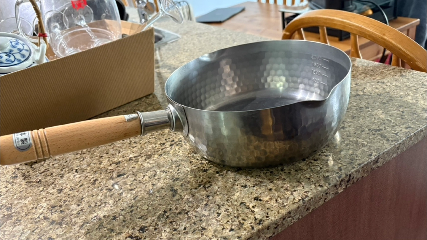 Selling a Japanese milk pan/saucepan. It's in good condition and ready for your kitchen! It has a wooden handle and measurements inside