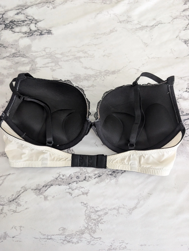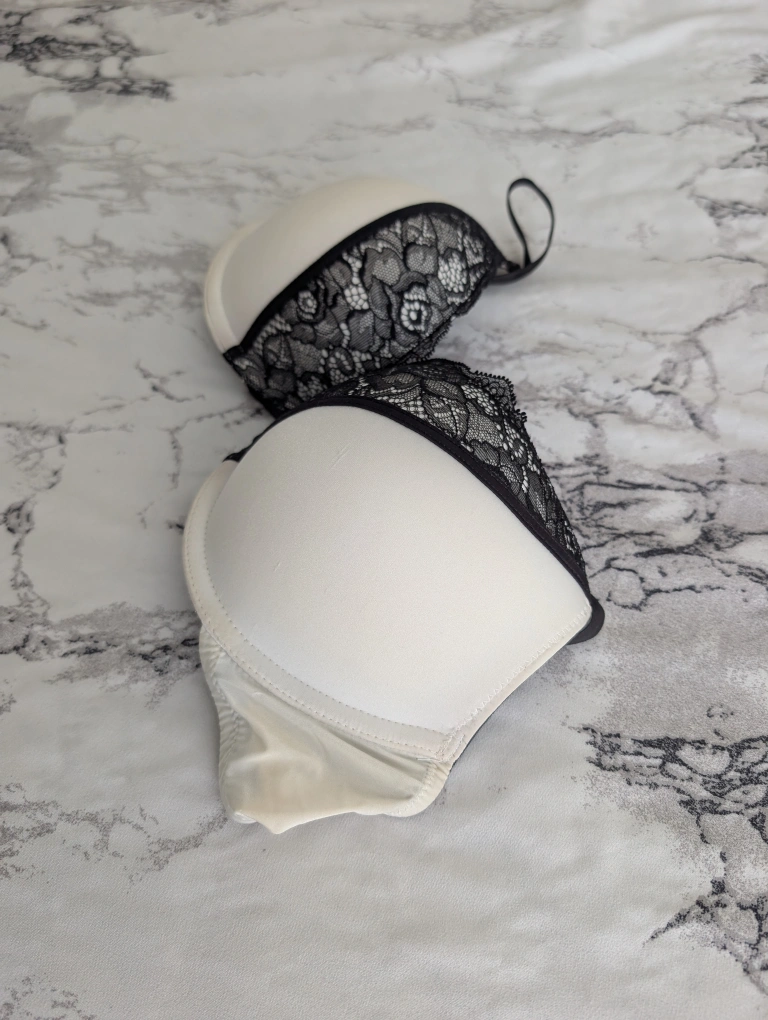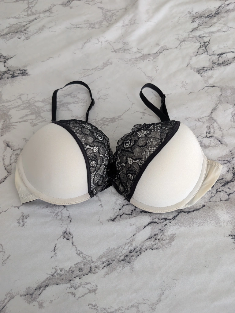 Selling a bra with white cups and black lace detailing. It's in great condition and ready for a new home!