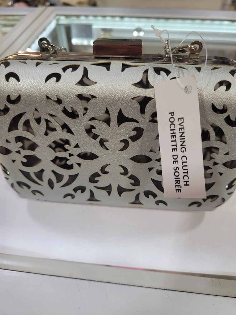 This is a lovely silver evening clutch, perfect for a night out! The laser-cut design gives it a unique and stylish look. It comes with a delicate chain strap for easy carrying. It's in great condition and ready for its next special occasion