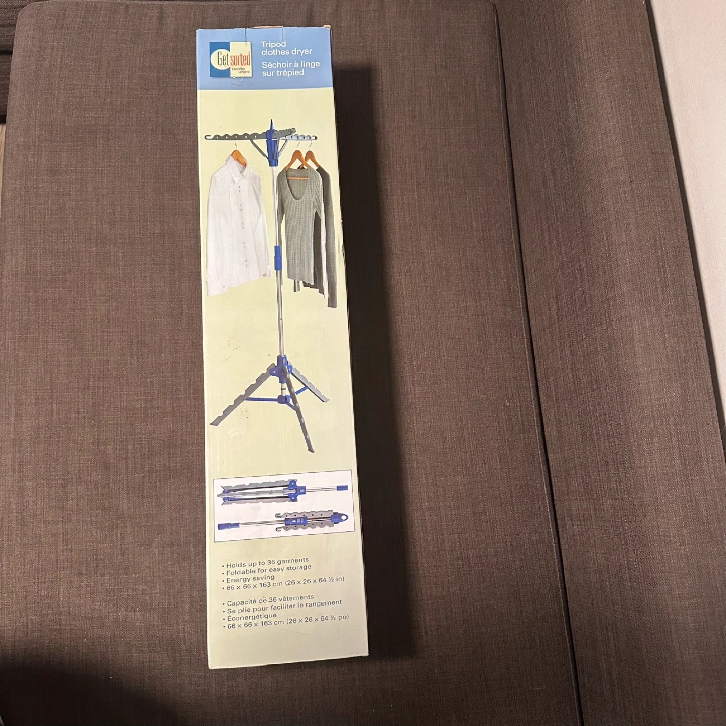 New in a box. This tripod clothes dryer is perfect for apartments or anywhere you need to save space! It holds up to 36 garments and folds easily for storage. Dimensions are 66 x 66 x 163 cm (26 x 26 x 64 1/2in). Energy saving too!