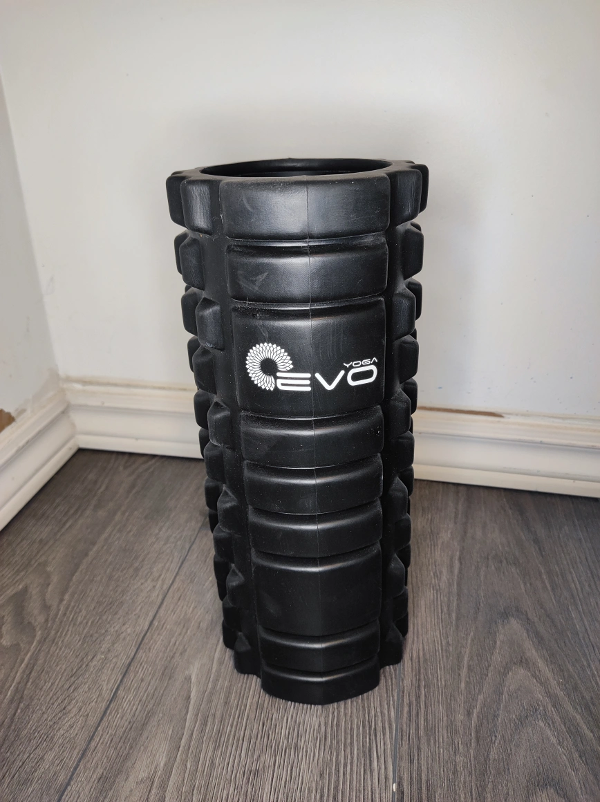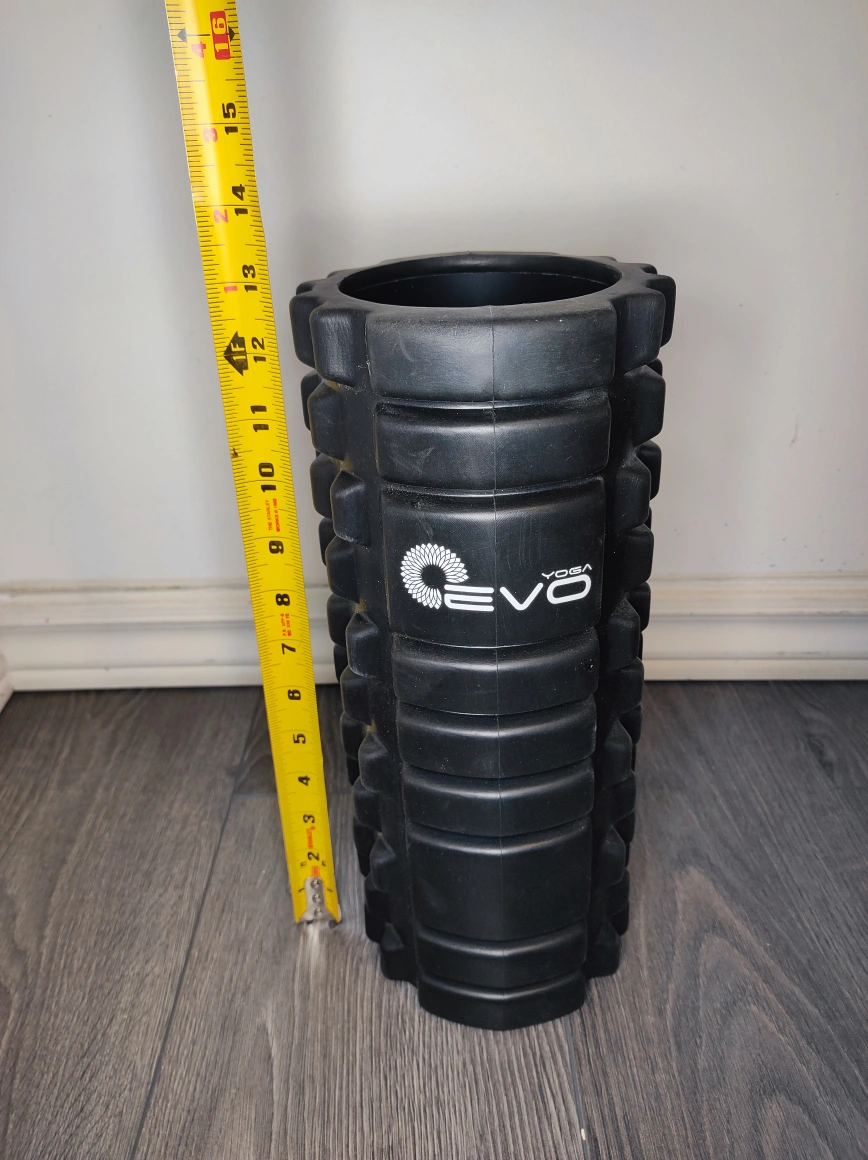 I'm selling a black EVO yoga roller. It's in great shape and ready to help you with your stretches and muscle recovery. It measures about 14 inches tall and 6 inches in diameter.