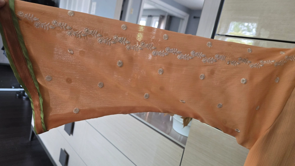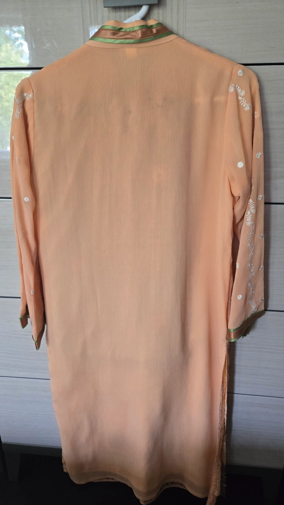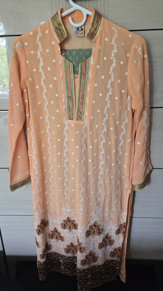 Beautiful peach-coloured kurti with delicate white embroidery and a unique green dupatta! Size medium chest size: 20" length: 43" comes with Kameez and dupatta