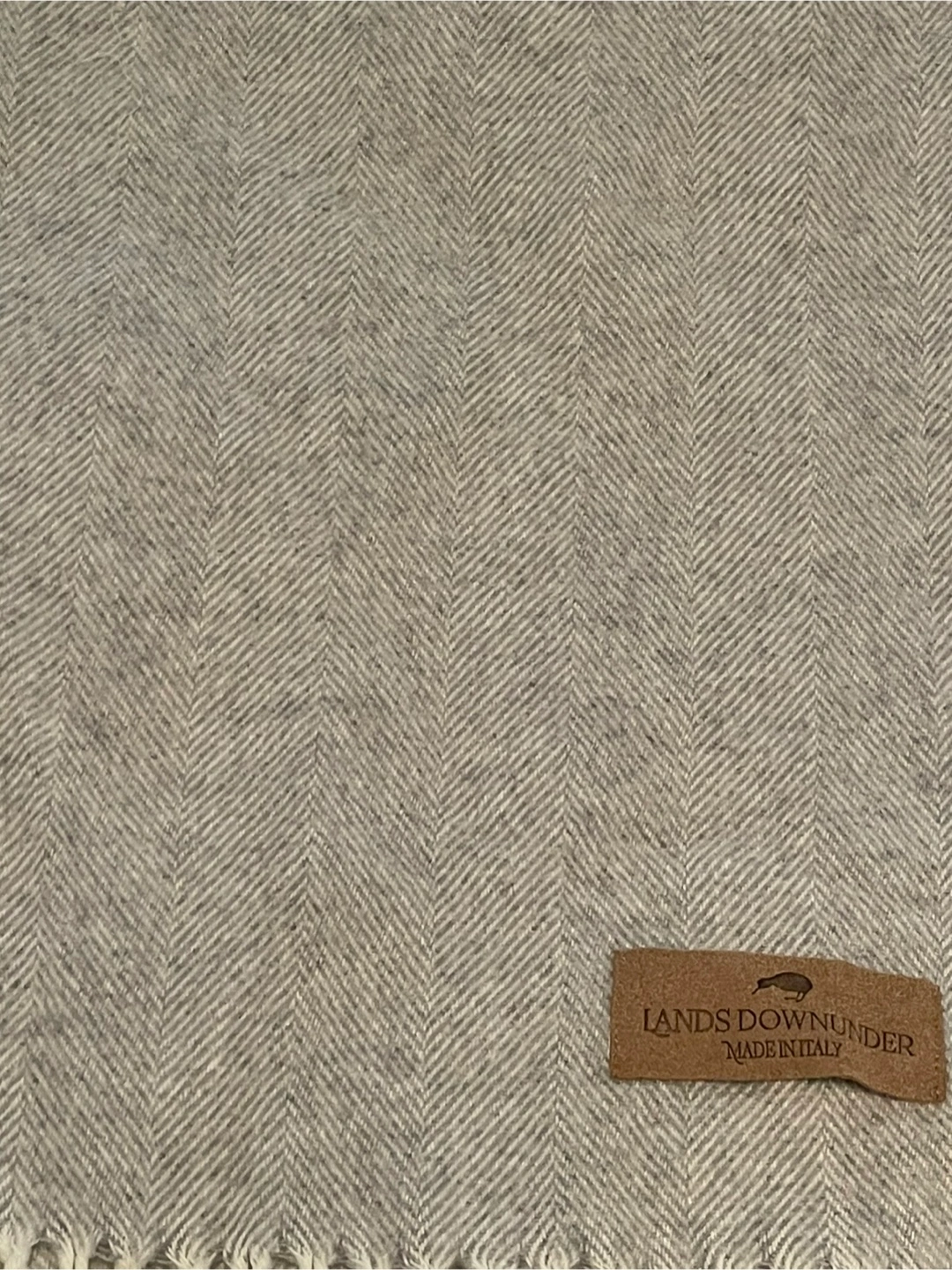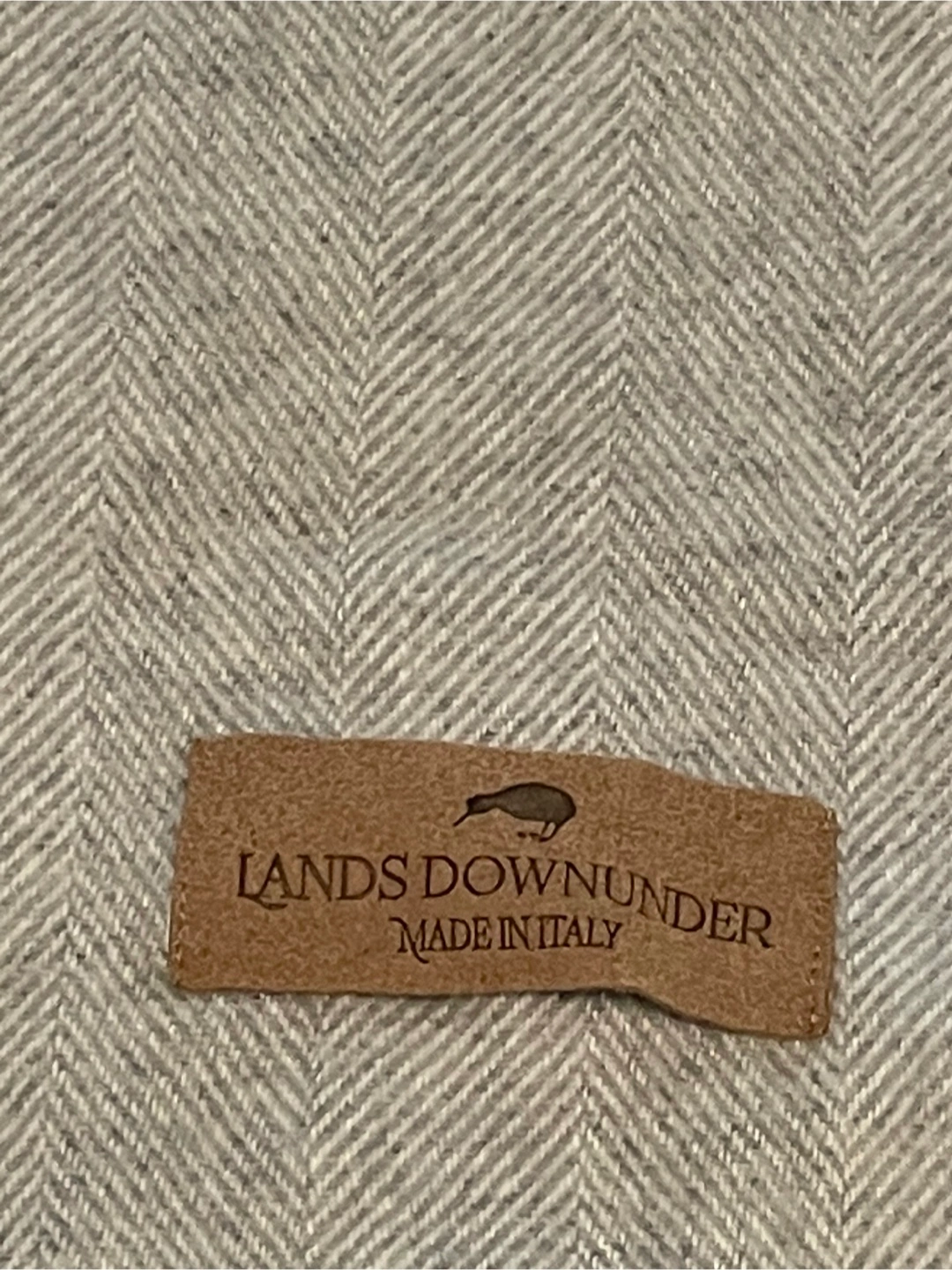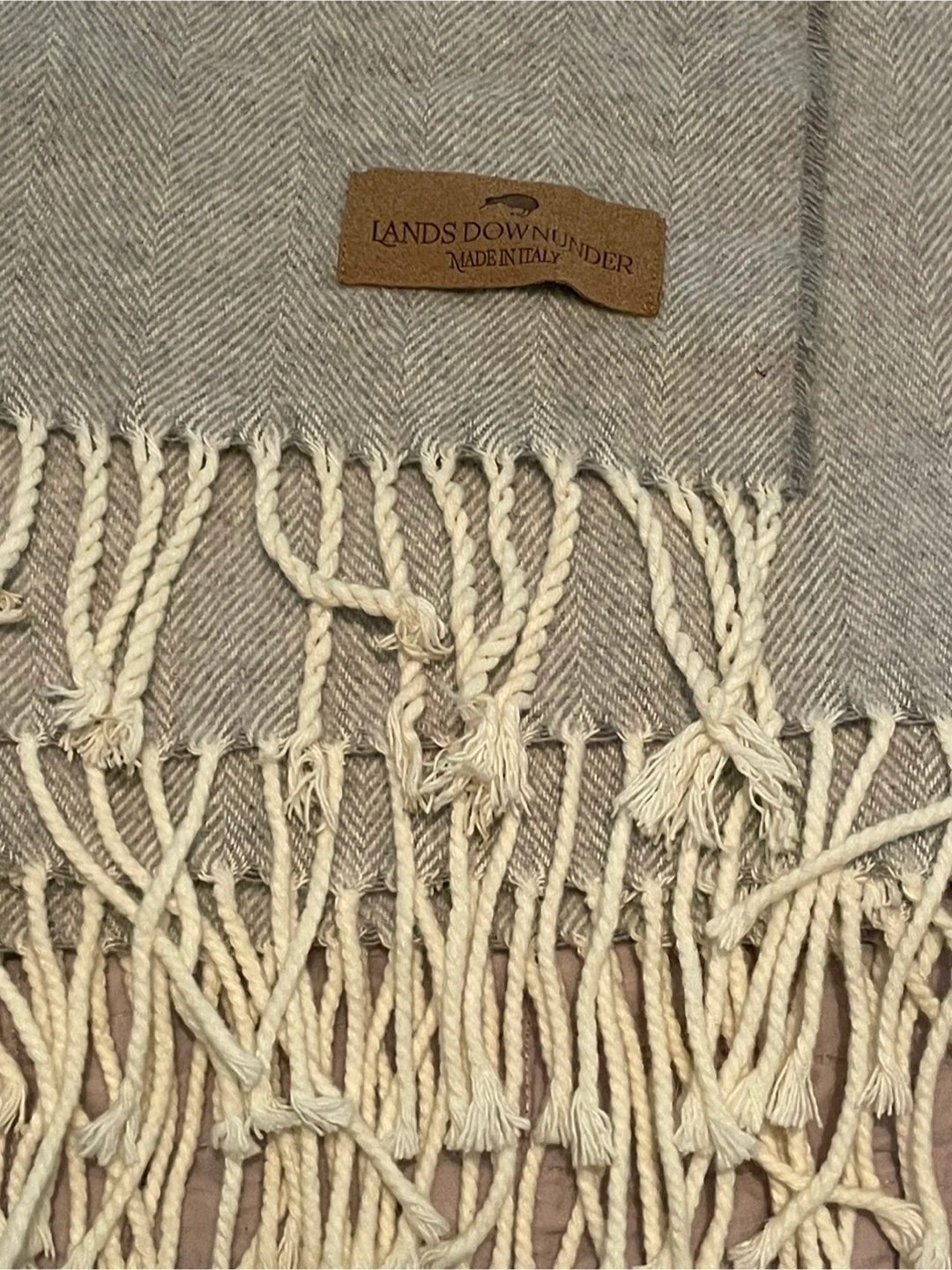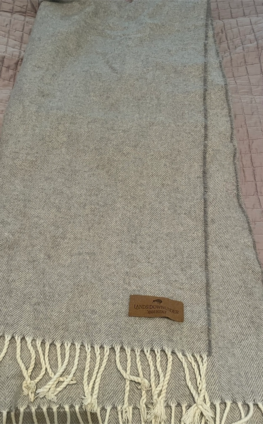 Selling a Lands Downunder throw blanket made in Italy! It has a lovely herringbone pattern and fringed edges. Perfect for adding a touch of cozy elegance to your home