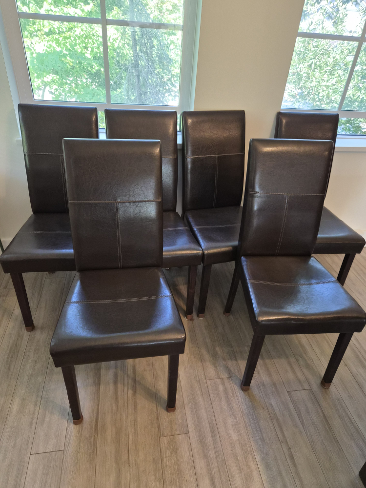 I'm selling a set of six dining chairs! They feature a dark brown faux leather upholstery and a simple, elegant design. They'd be perfect for adding a touch of sophistication to your dining room or kitchen. They are in good condition and ready for a new home. and one of chair leg is little bit unstable