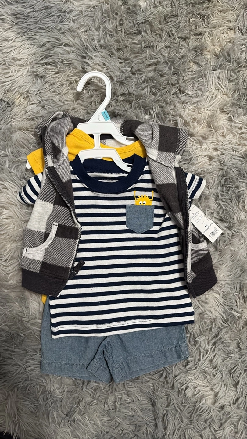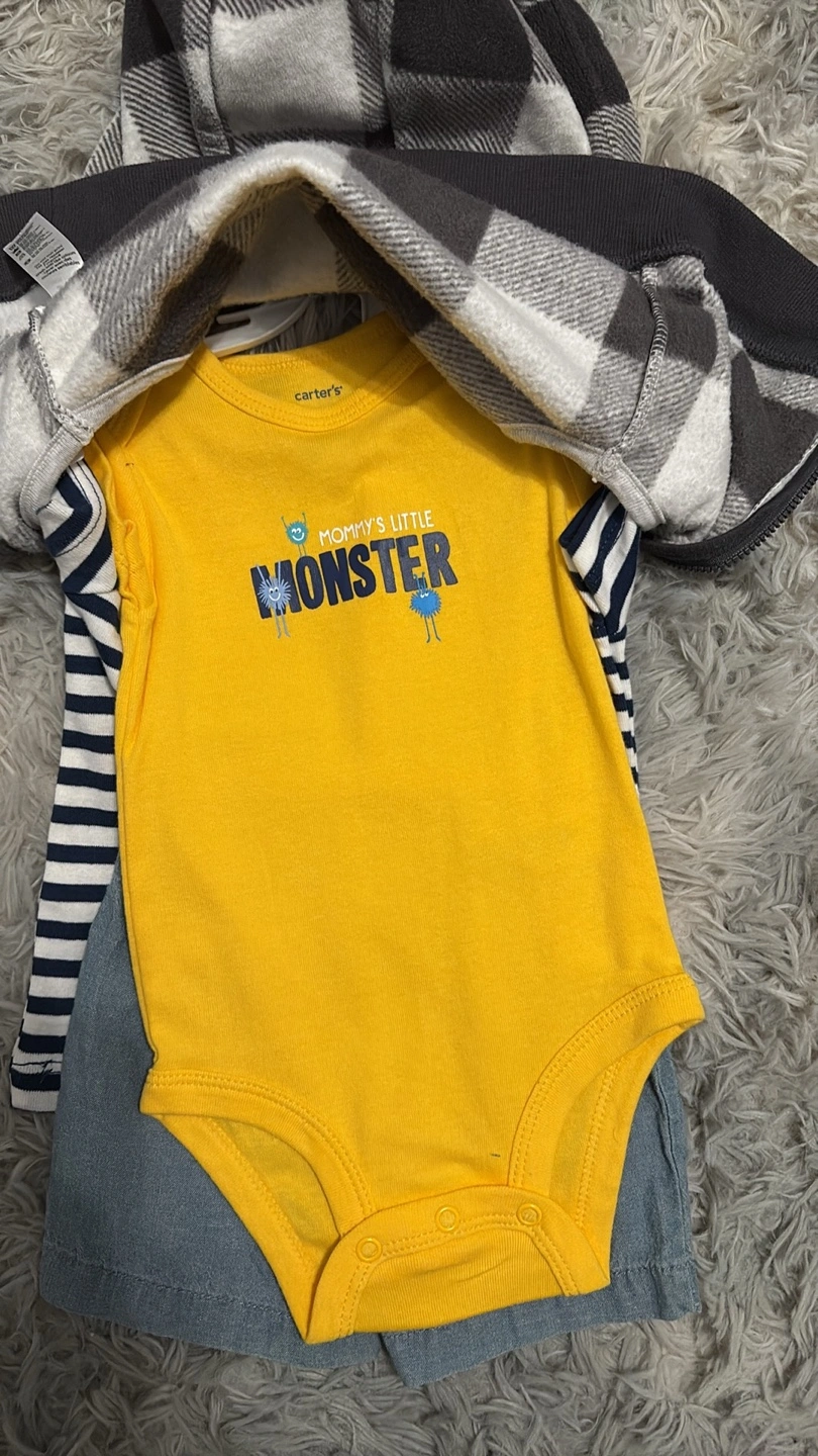 Here's a cute Carter's baby outfit set in size 3-6m .It includes a yellow bodysuit with a 'Mommy's Little Monster' design, a striped shirt, denim shorts, and a hooded plaid jacket. Perfect for your little one!