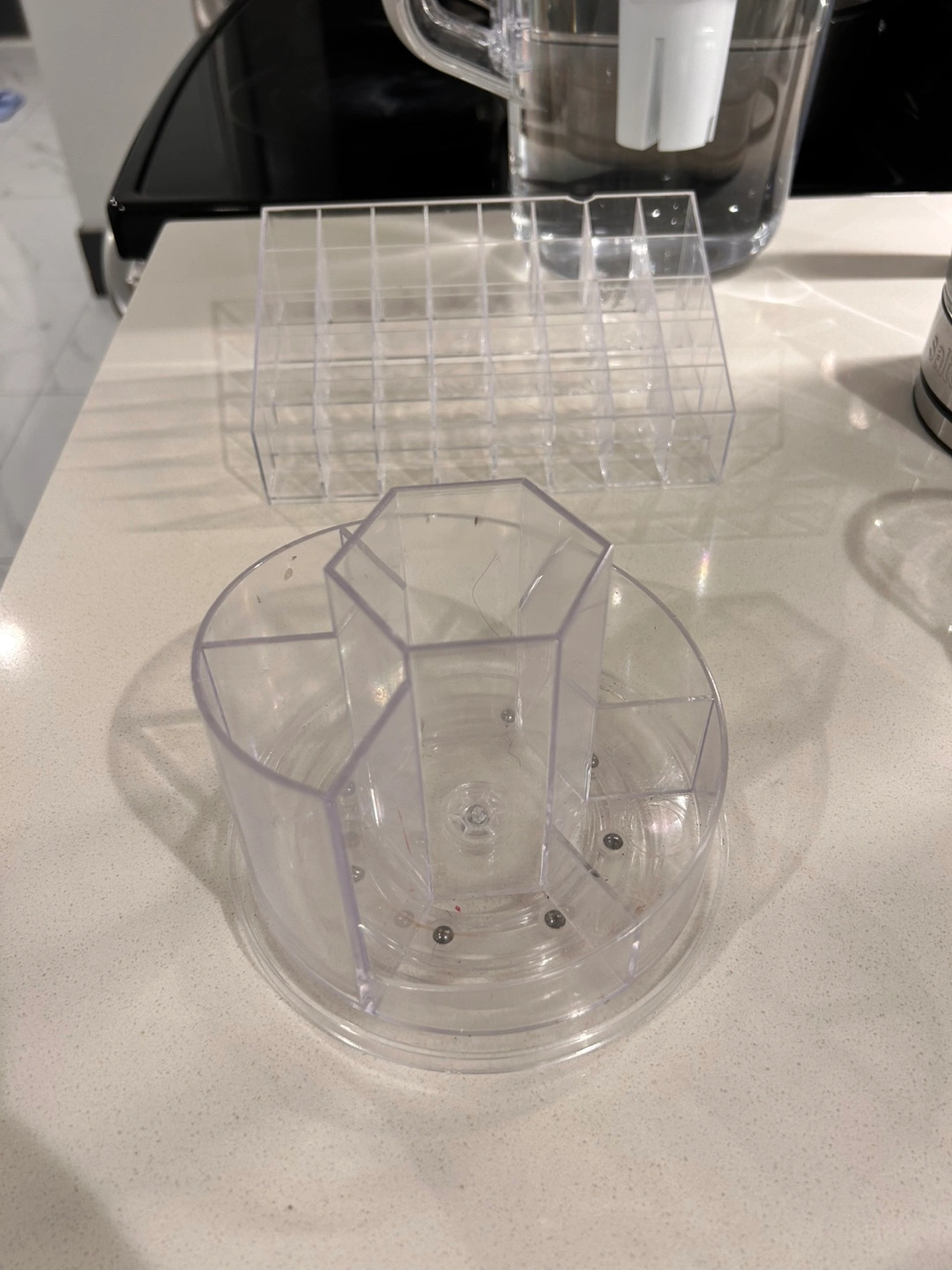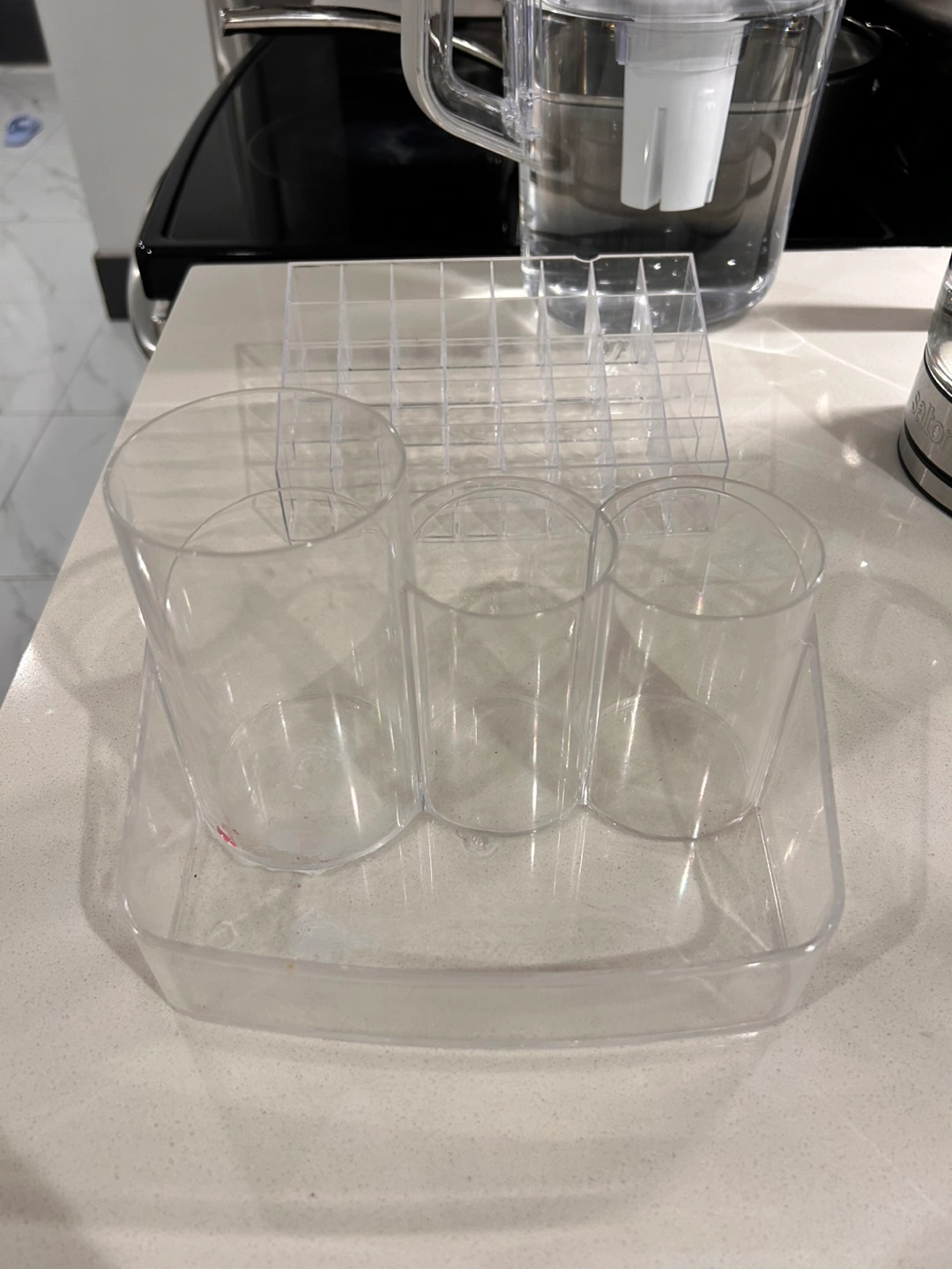 Declutter your space with this clear acrylic makeup organizer set! It's perfect for keeping your cosmetics, brushes, and other essentials neatly arranged. The set includes various compartments and sections to suit different storage needs. A great addition to any vanity or bathroom countertop!