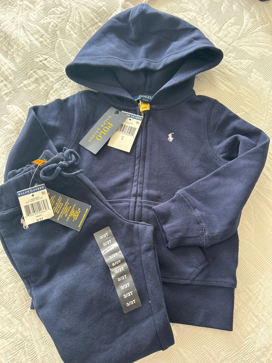 This is a brand new Ralph Lauren matching set! It includes a navy blue hoodie and pants, both in size 3/3T. Perfect for your little one!