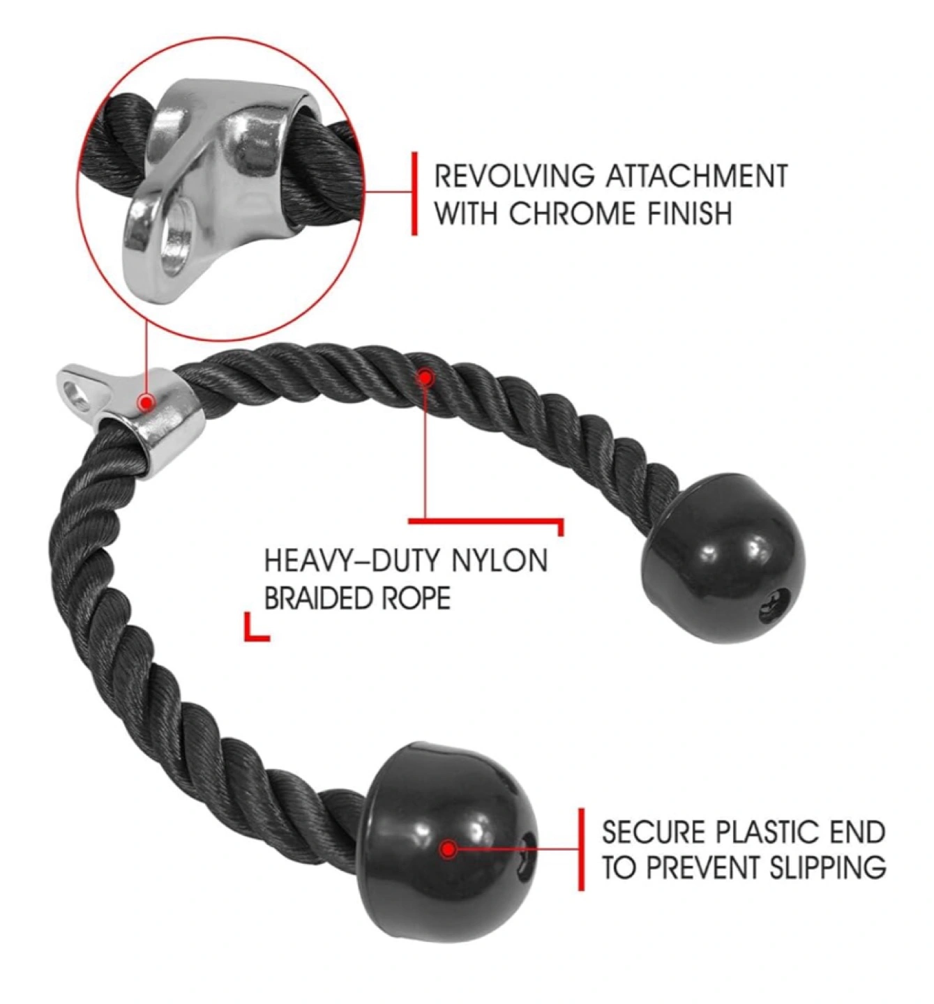 Selling a brand new 26” tricep extra thick rope pull down cable attachment! It features a heavy-duty nylon braided rope with secure plastic ends to prevent slipping. The revolving attachment has a chrome finish, making it a durable and effective addition to your workout routine