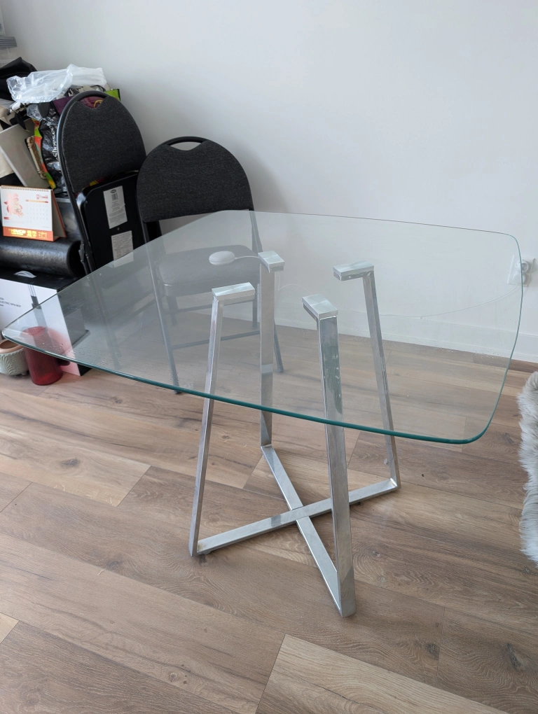 Selling a glass top dining table! It features a sleek glass top and stylish chrome legs. It's in great condition and would be a lovely addition to any dining space