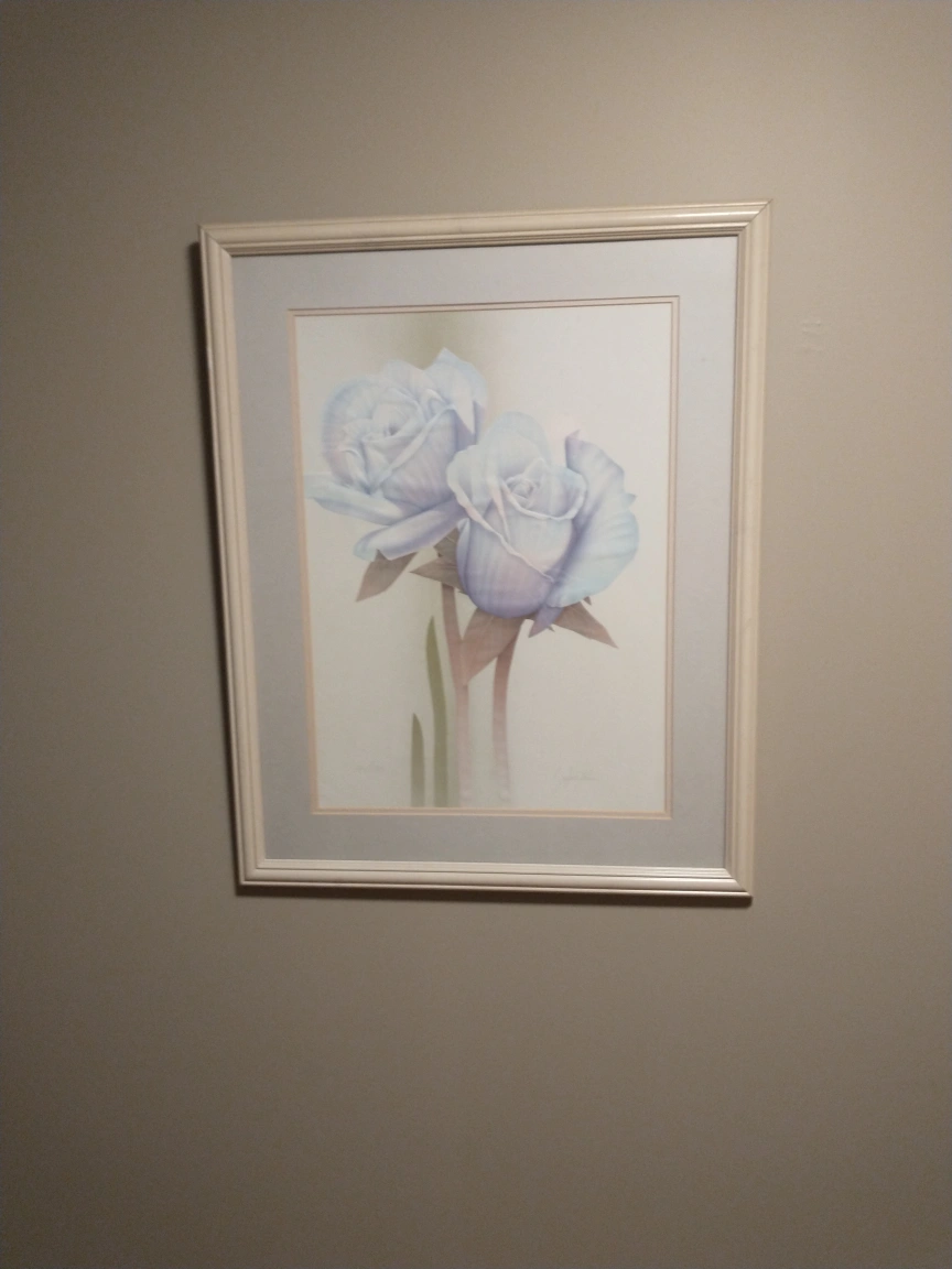 This is a lovely framed art print featuring blue roses. It's in great shape and would add a touch of elegance to any room. Perfect for adding a bit of charm to your home decor