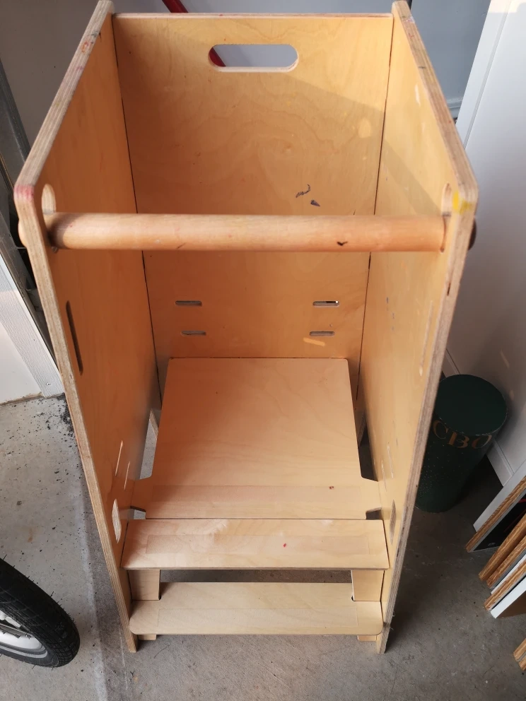 Selling a wooden kids learning tower. It's in great condition and ready for a new home! Perfect for helping your little one reach the counter and participate in kitchen activities or other tasks. It is made of wood and has a natural finish.