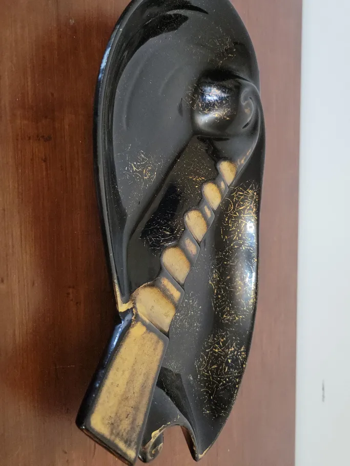 Selling a vintage ashtray made in Japan! It's black with gold accents and a unique design. Great for collectors or as a decorative piece
