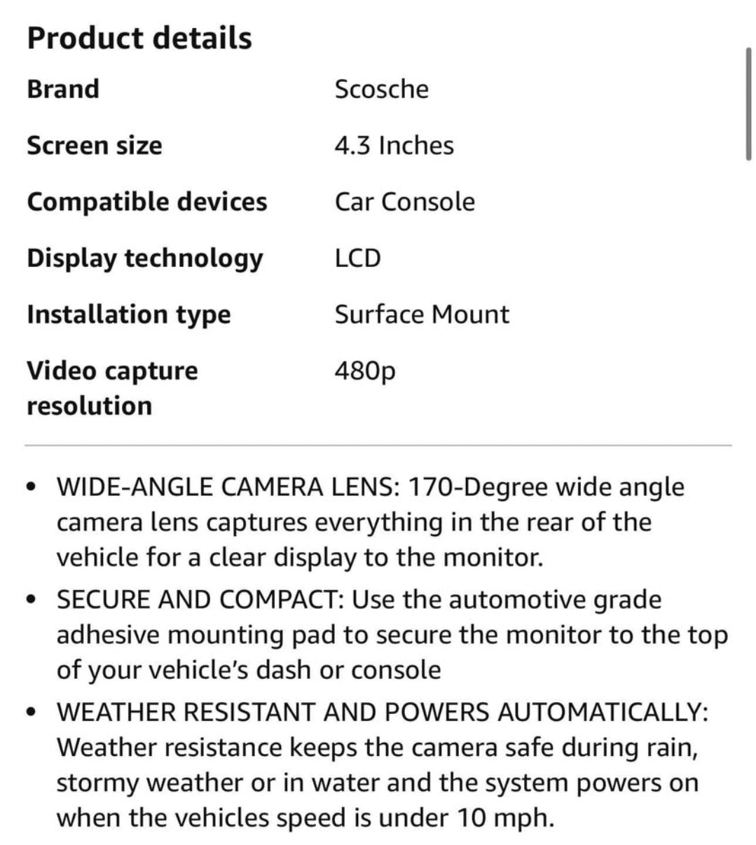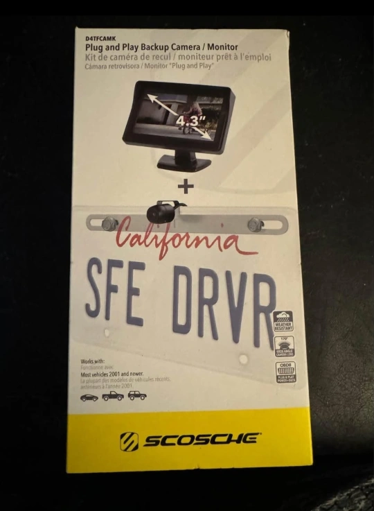 Enhance your driving safety with this Scosche Plug and Play Backup Camera and Monitor Kit, featuring a 4.3-inch display and a wide-angle lens to capture a clear view of what's behind your vehicle. This easy-to-install kit works with most vehicles from 2001 and newer. The box is opened but the unit has never been used. Key Features: * Brand: Scosche * Screen Size: 4.3 Inches * Compatible Devices: Car Console * Display Technology: LCD * Installation Type: Surface Mount * Video Capture Resolution: 480p * Wide-Angle Camera Lens: 170-degree wide angle lens * Secure and Compact: Automotive-grade adhesive mounting pad * Weather Resistant: Keeps the camera safe during rain and stormy weather; powers automatically when the vehicle's speed is under 10 mph. If the ad is up, it's available! PICKUP ONLY in Erinwoods.