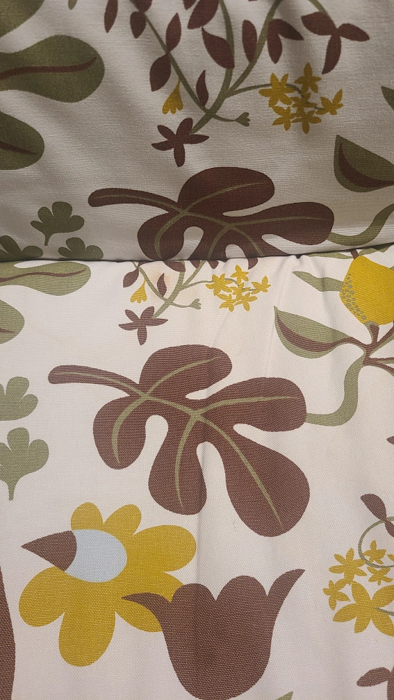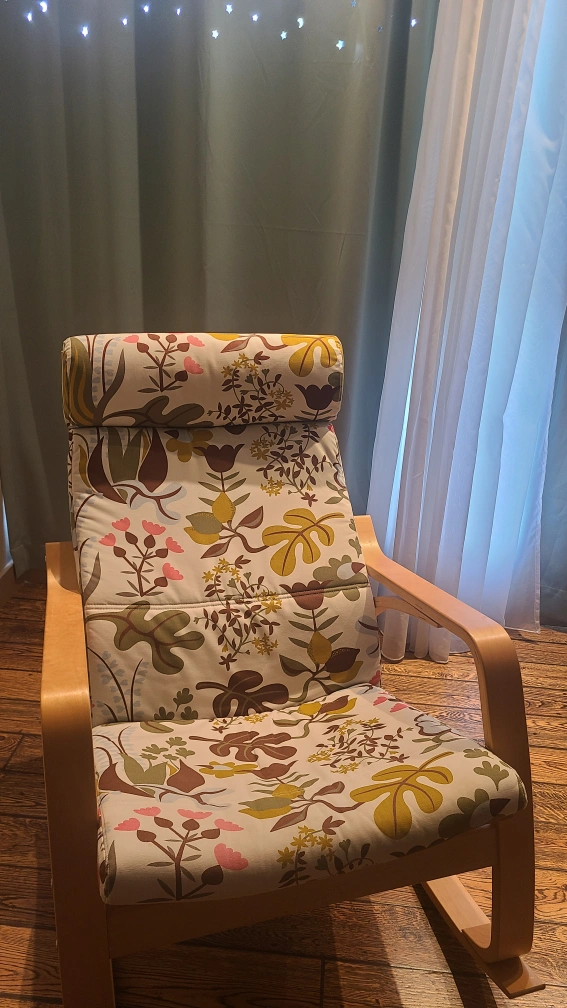 Selling a gently used IKEA Poang rocking chair. It features a comfortable floral patterned cushion and a light wood frame. There is a small stain on the cushion (see photos).