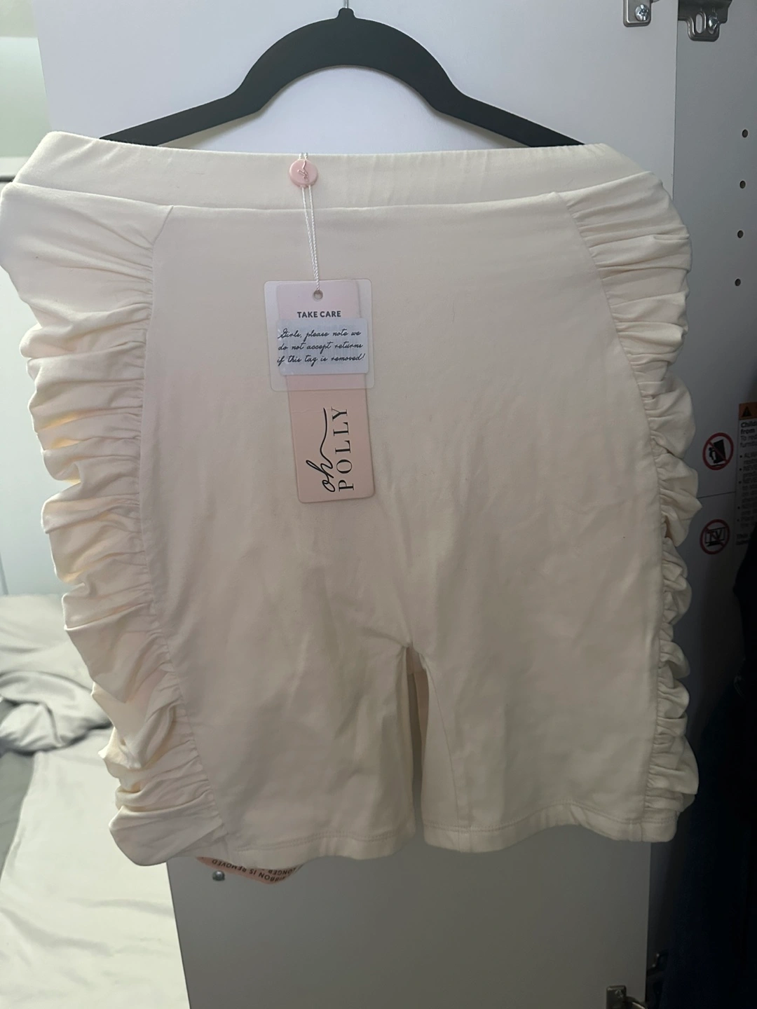 Cute Oh Polly ruffle shorts in a size small! They're a lovely cream colour and feature a fun ruffle detail on the sides. Perfect for adding a little something extra to your outfit