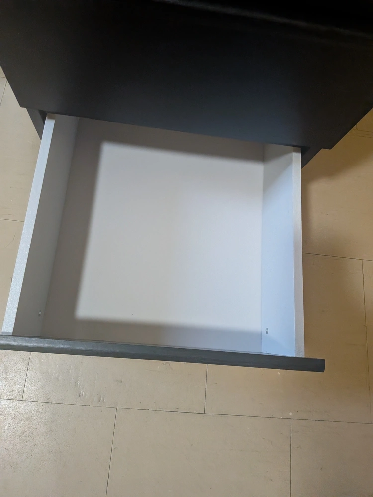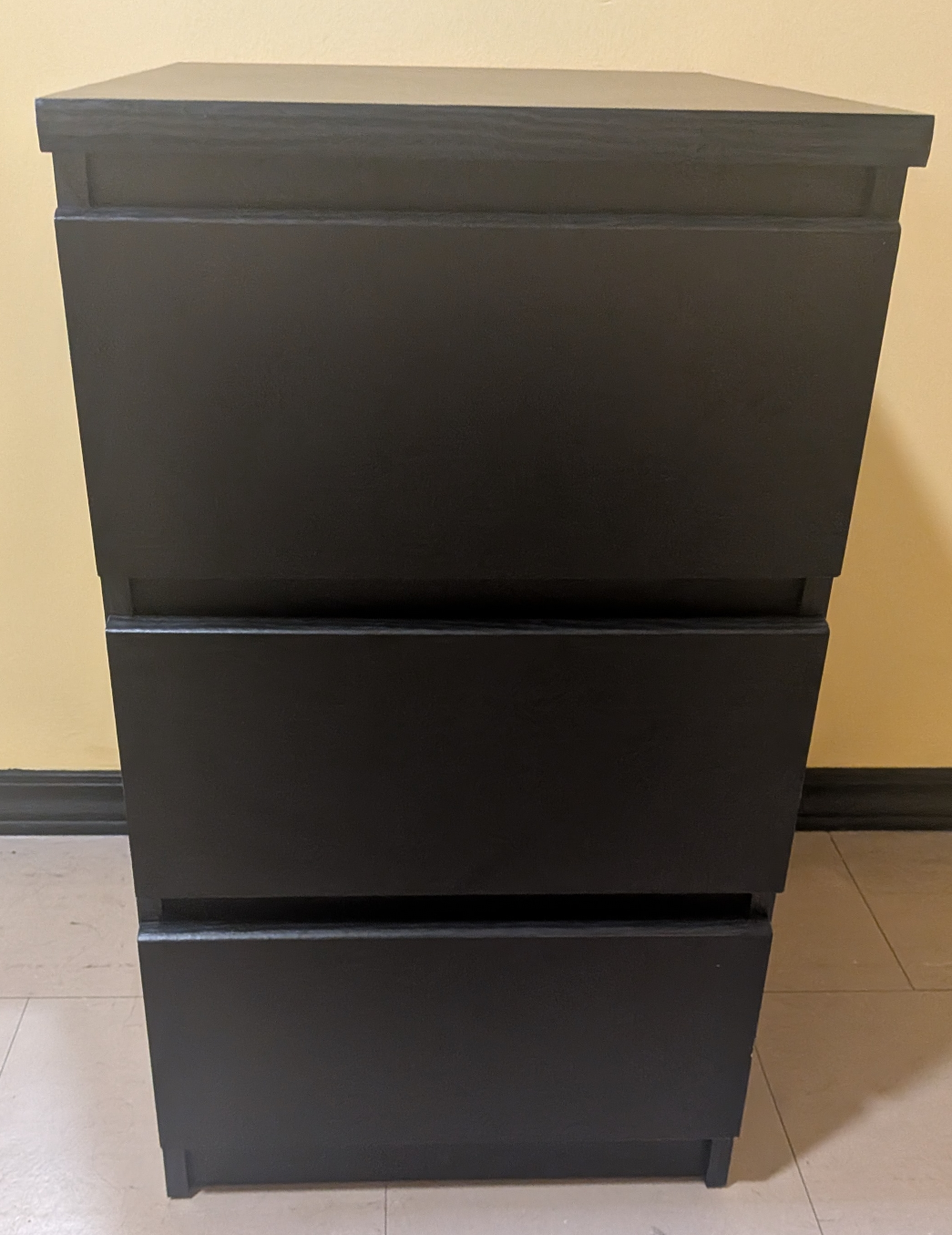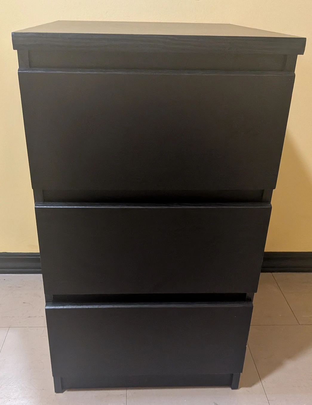 Selling a black 3 drawer dresser/nightstand. It has some signs of wear, but the drawers are clean and spacious. Good condition