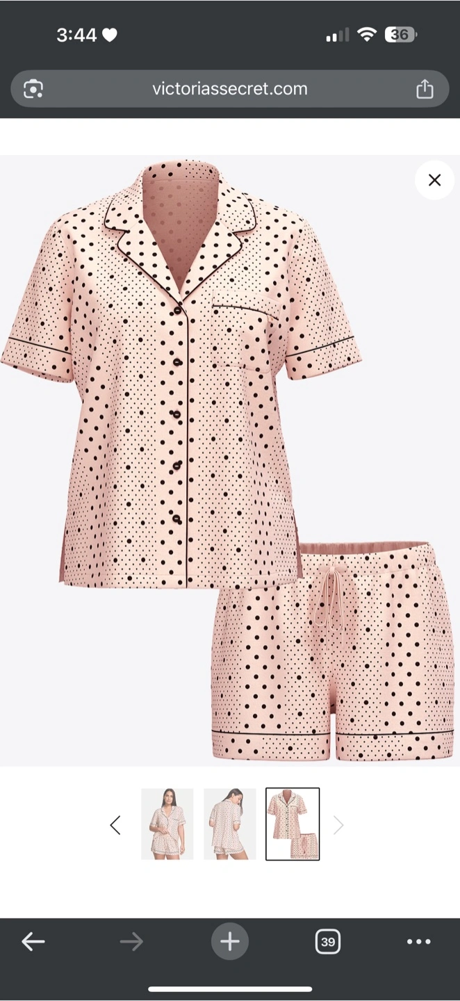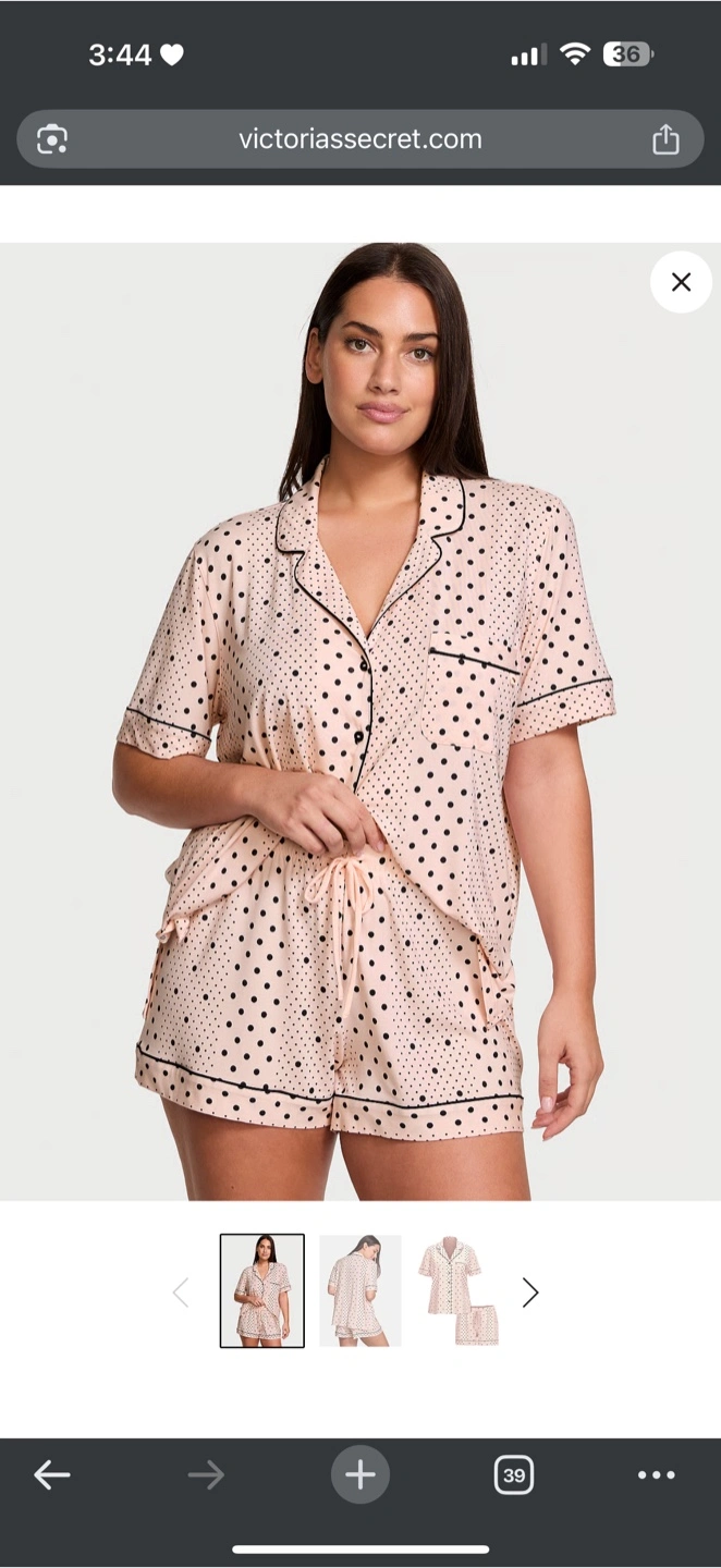 Super cute Victoria's Secret pajama set! It's a short-sleeved top and shorts combo, perfect for warmer nights. The material is soft and comfy, and the polka dot pattern is adorable. Great for lounging around the house!