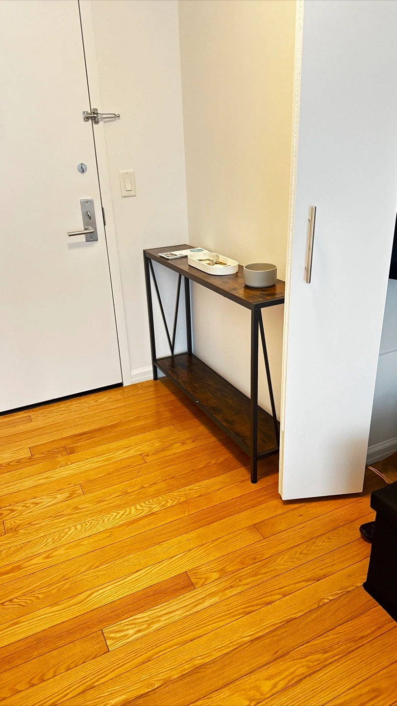 Selling a console table that's in great shape! It has a rustic brown top and a black metal frame. Perfect for an entryway or living room to display items or as a small bookshelf