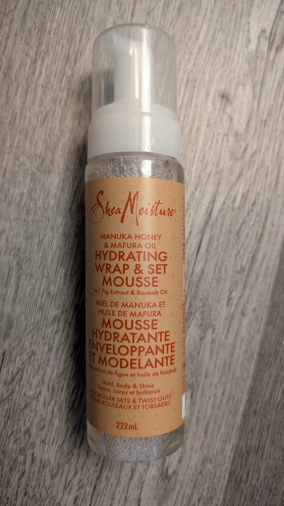 Selling a bottle of Shea Moisture Manuka Honey & Mafura Oil Hydrating Wrap & Set Mousse! It's got fig extract and baobab oil, perfect for roller sets and twist outs. It's 222 mL and helps with hold, body, and shine