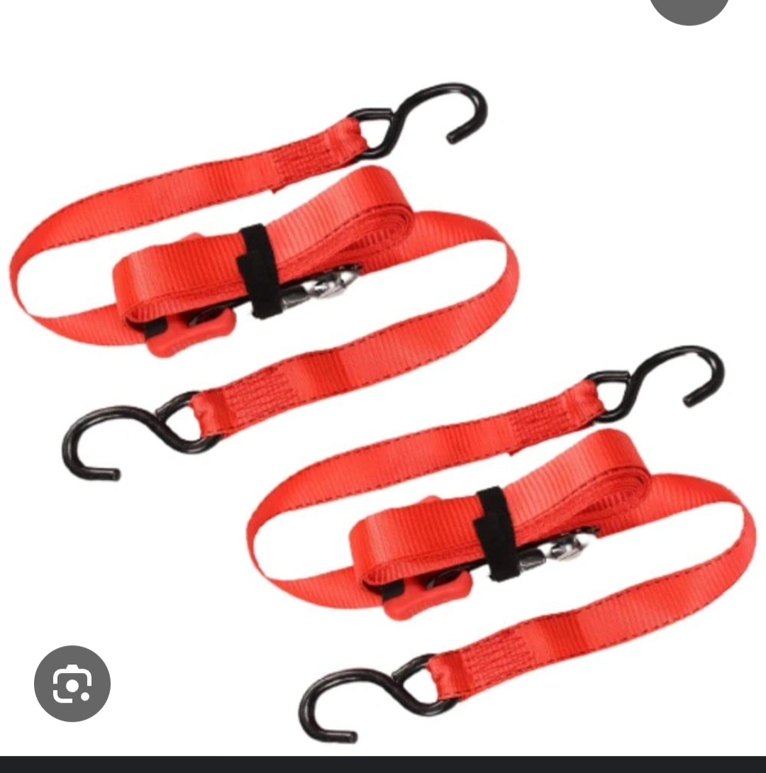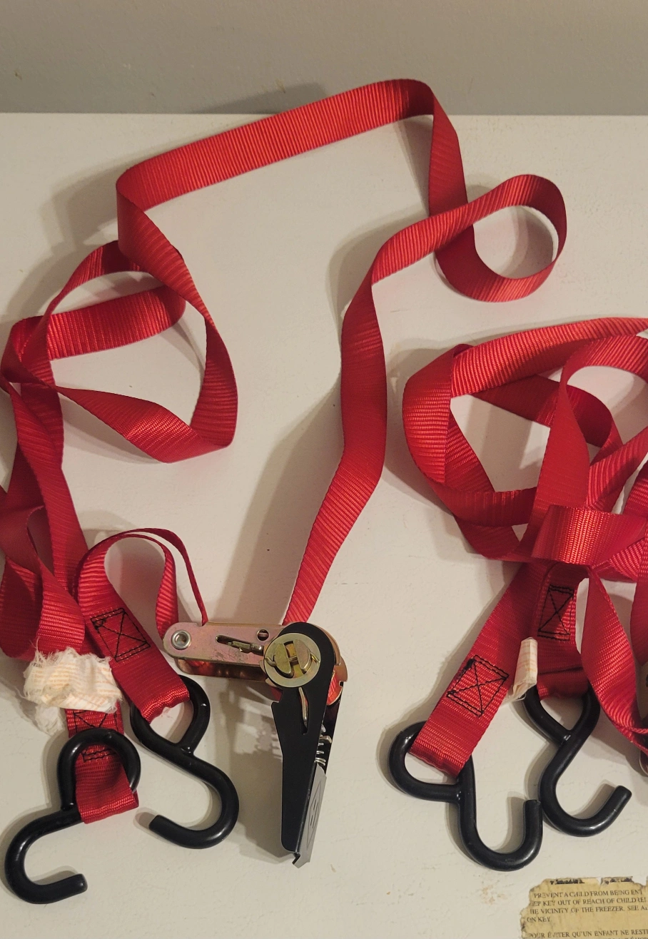 Here are some red ratchet tie down straps! They are perfect for securing items during transport. Bought from canadian tire.Only used once and they are in a very good condition.