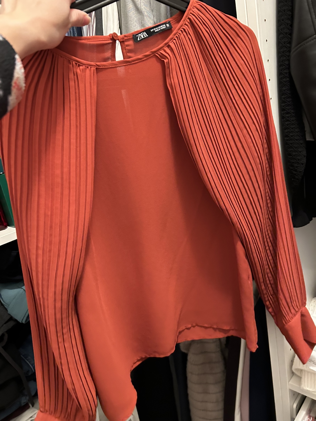 Selling a lovely Zara blouse with pleated sleeves! It's a size medium and in great condition. The colour is a beautiful terracotta, perfect for adding a pop of warmth to your wardrobe