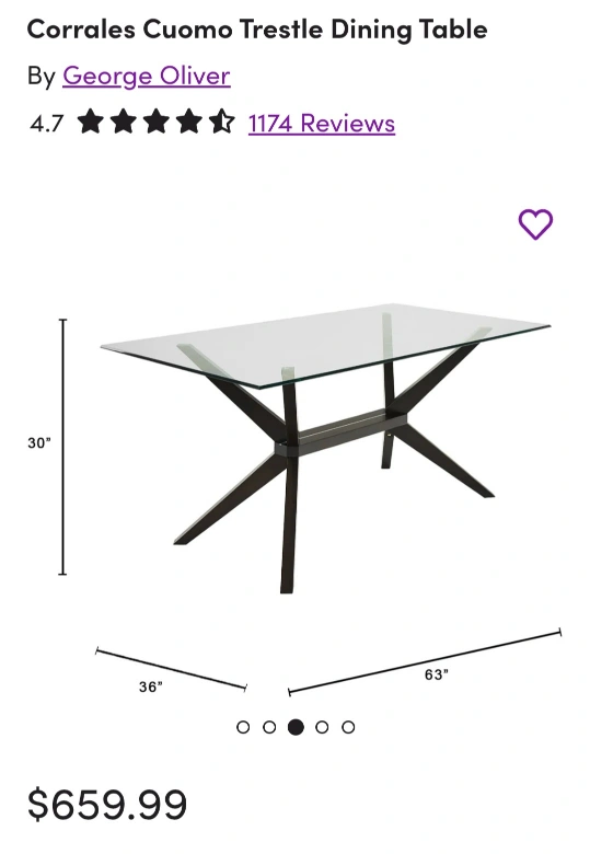 Selling a George Oliver Corrales Cuomo Trestle Dining Table. The dimensions are 30" height, 36" width, and 63" length. Originally bought for $659.99
