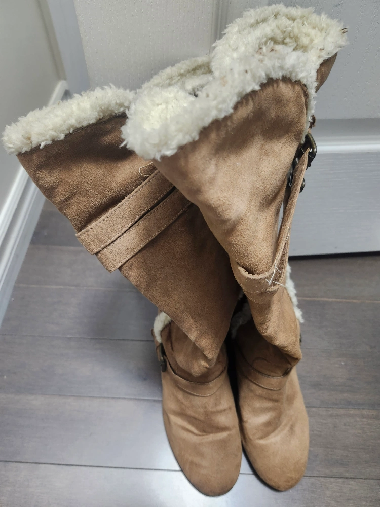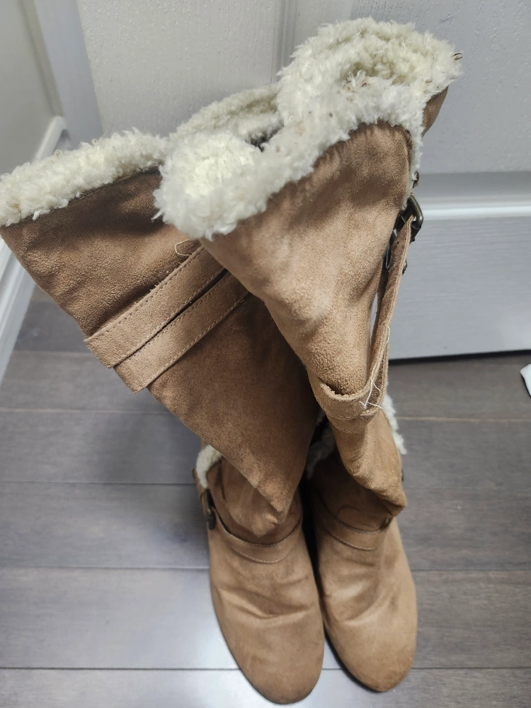 These are a pair of cute brown suede boots! They feature a cozy faux fur trim and buckle details. Perfect for adding a touch of style to your fall or winter outfits. They're in good condition and ready for a new home!
