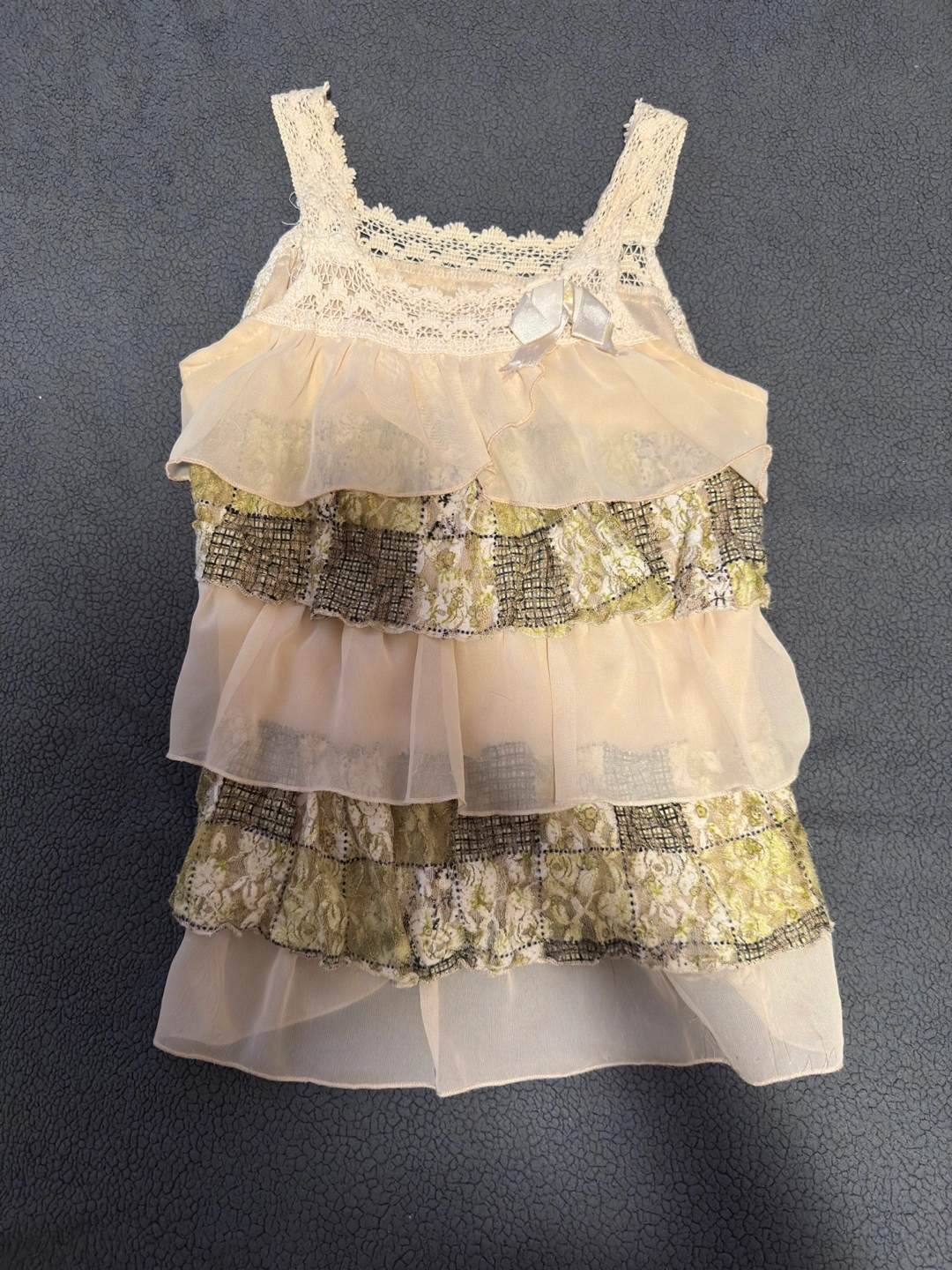 This is a cute dress with layered ruffles. It features lace detailing on the top and a ribbon accent. Perfect for a special occasion or just dressing up!