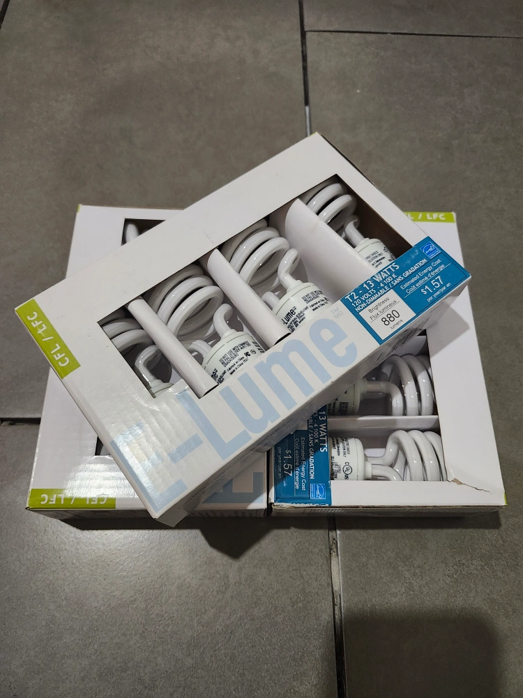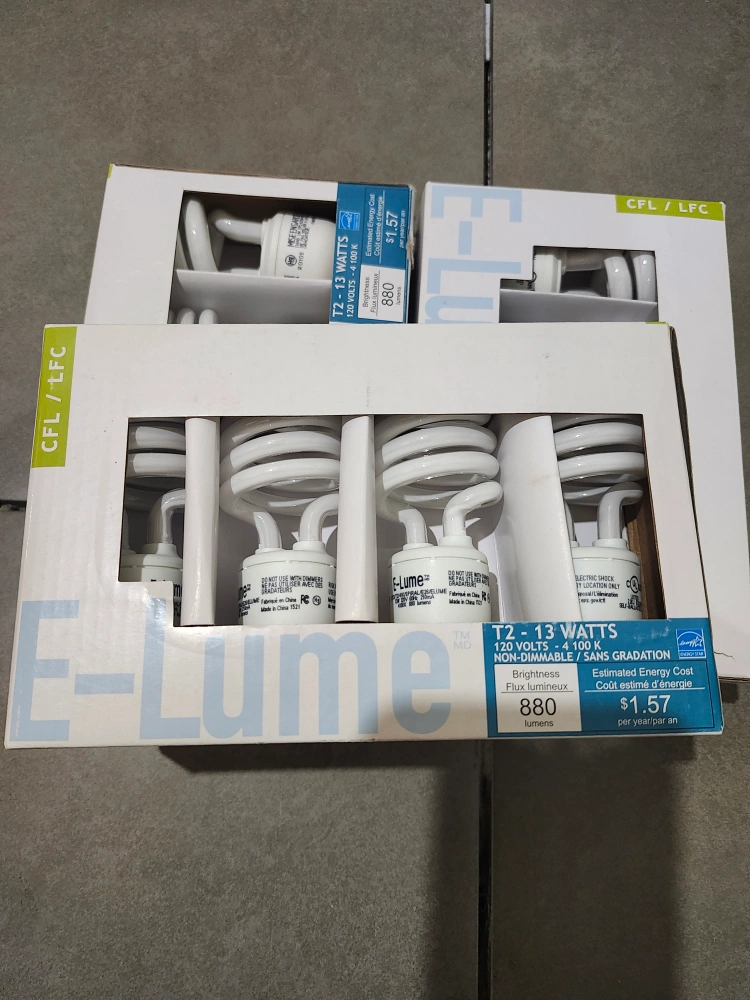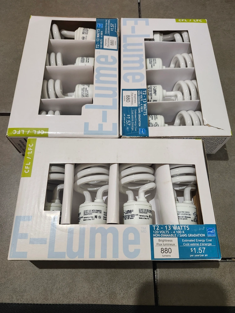 Selling three boxes of E-Lume T2 13 Watts CFL light bulbs. They are brand new and still in their original packaging. Each bulb is 120 Volts and 4100 K. These bulbs are non-dimmable and have a brightness of 880 lumens. Great for energy saving!
