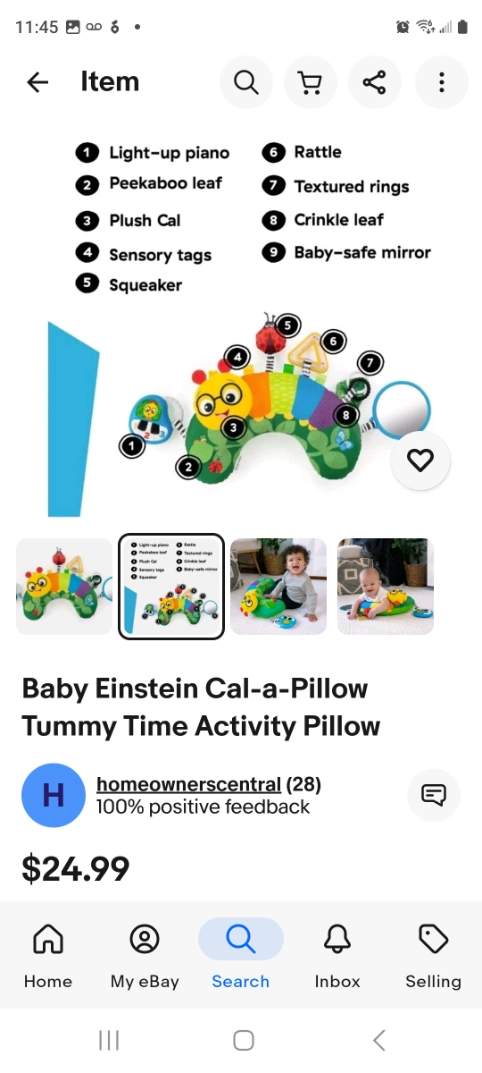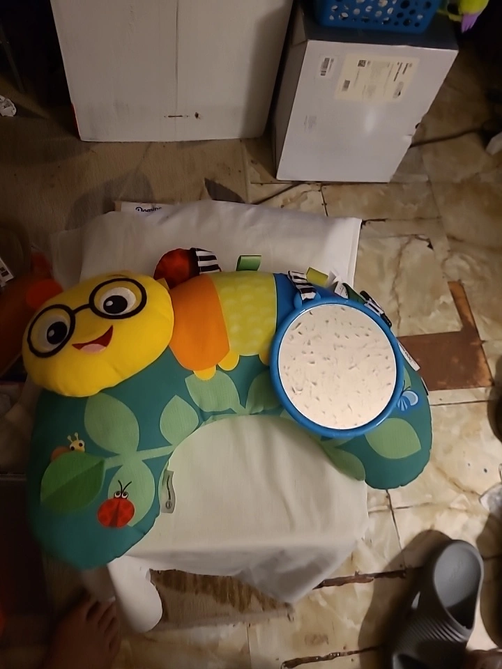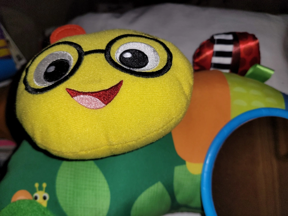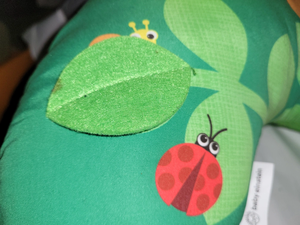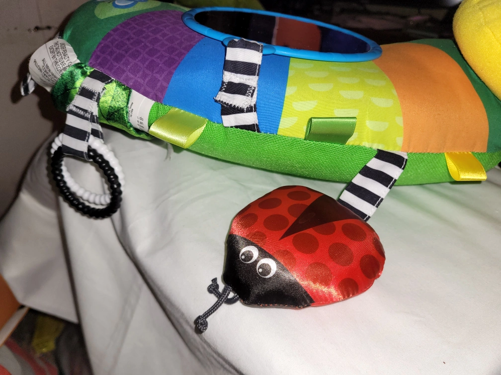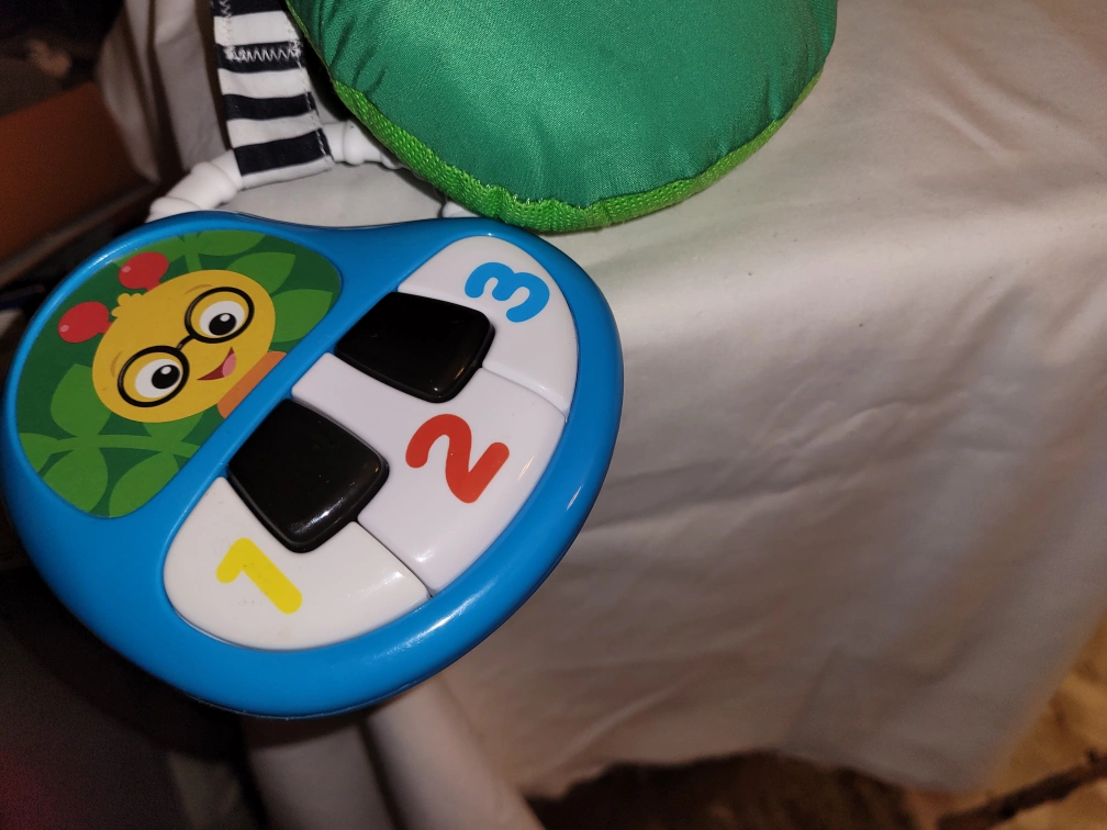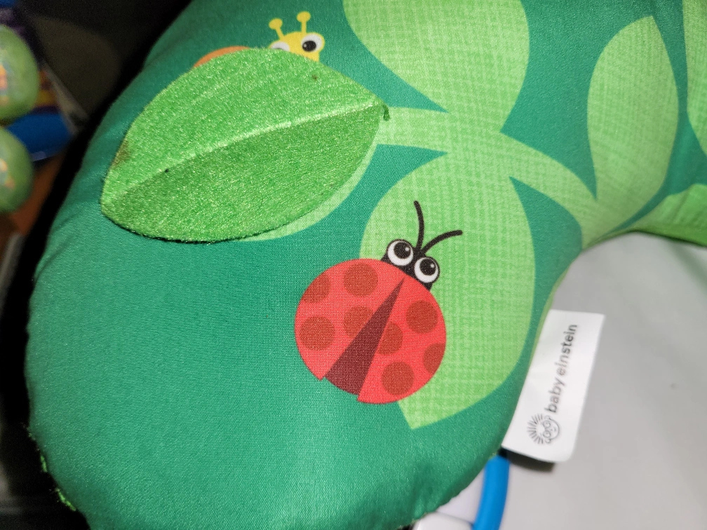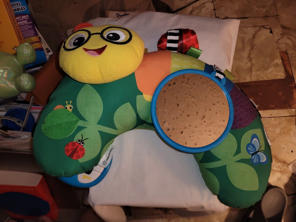 This Baby Einstein caterpillar pillow is in great condition and ready for a new home! It features colorful designs and a built-in mirror for your little one to enjoy. This item also has a mini piano attached (that works but needs it's batteries replaced) and it is missing the triangle toy.