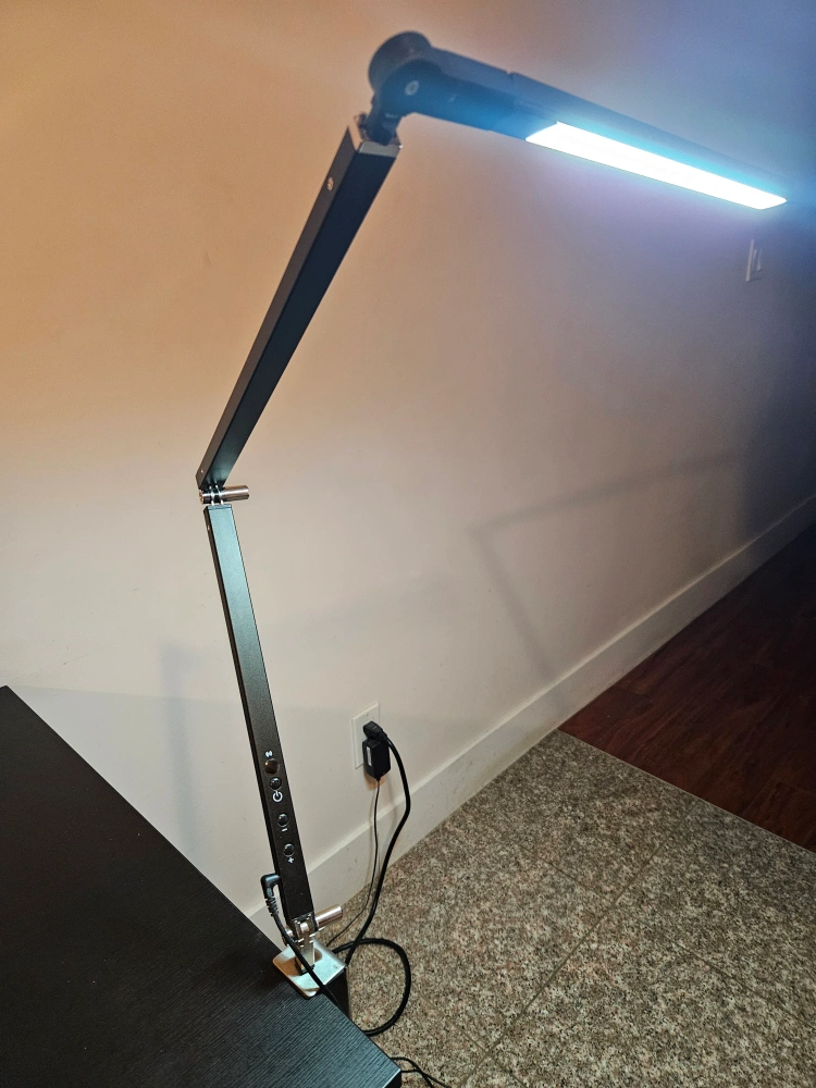 Selling a sleek black LED desk lamp. It's in great condition and provides excellent lighting for any workspace. Perfect for a desk or table, it's easy to adjust and use with clamp. As well adjusts brightness (2 levels) with remote control