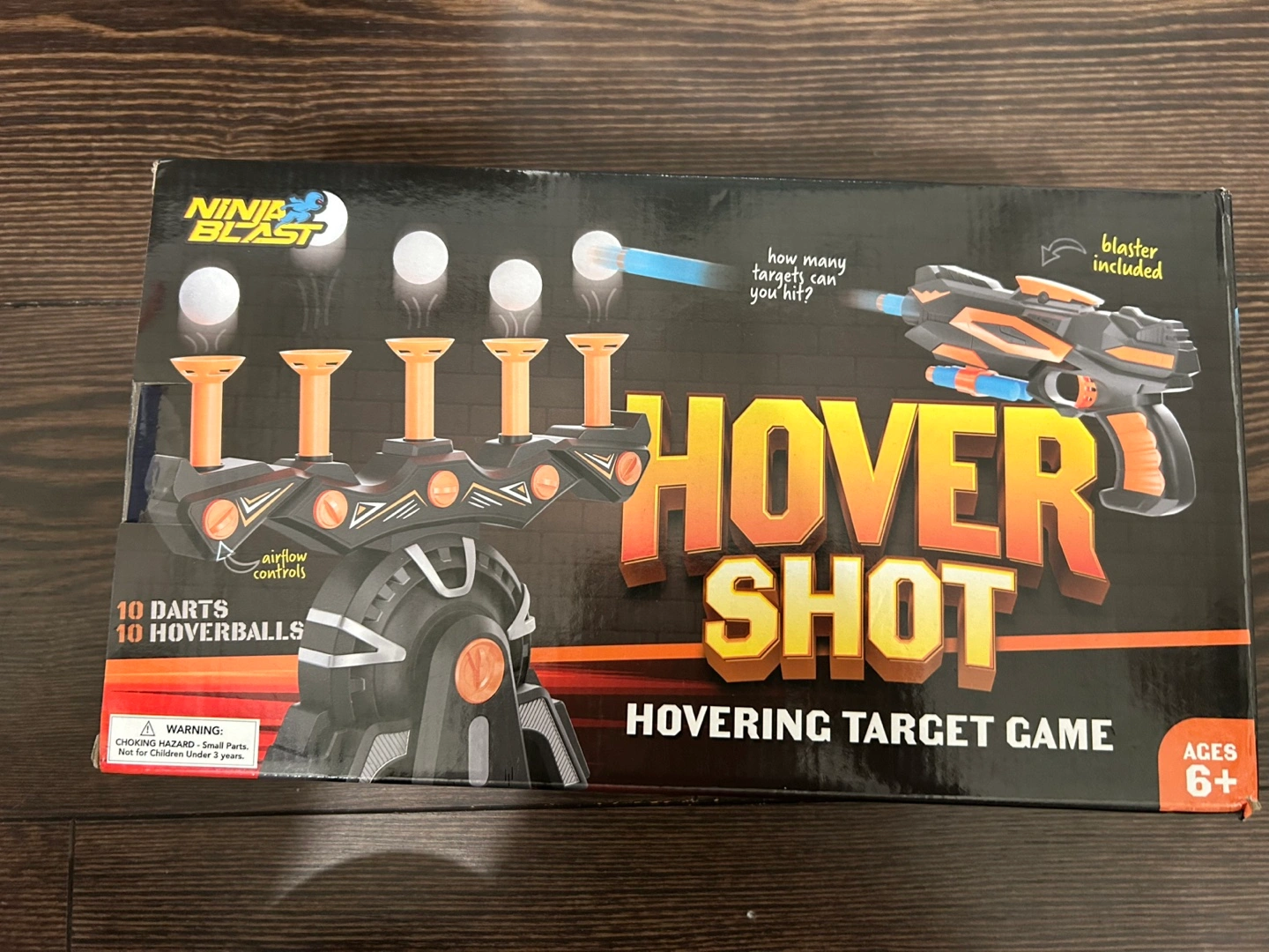 Get ready for some fun with the Ninja Blast Hover Shot game! It includes a blaster and is suitable for ages 6+. Comes with 10 hoverballs for lots of playtime!