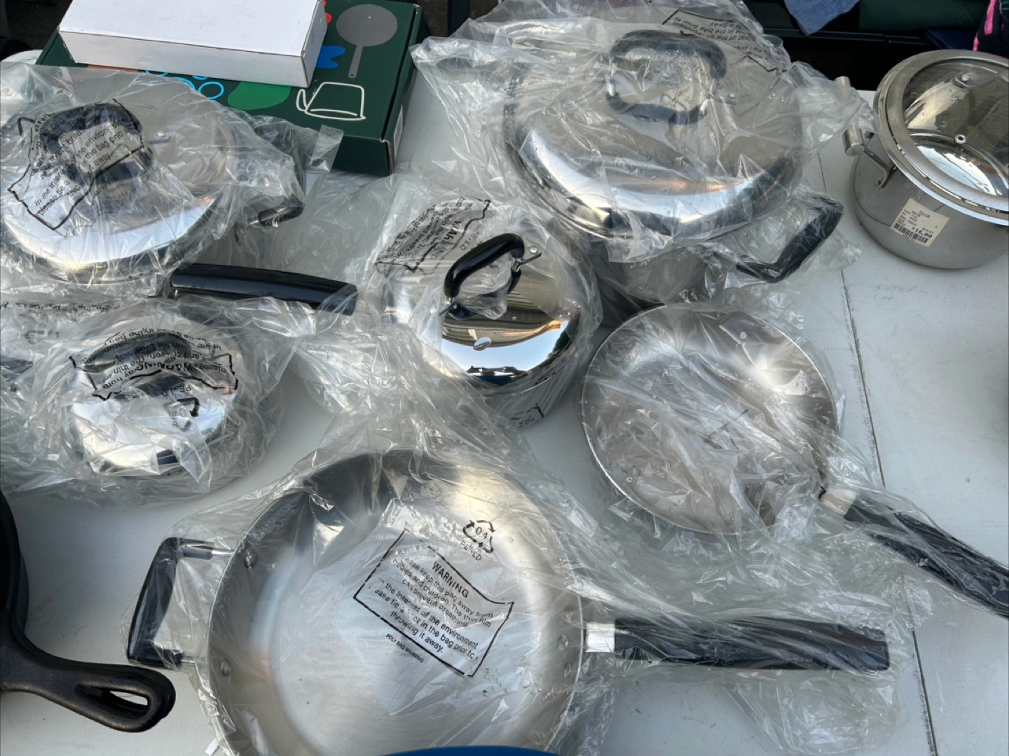 Selling a set of stainless steel cookware. It includes several pots and pans with lids, all still in their original packaging. The set appears to be in new condition, still sealed in plastic.