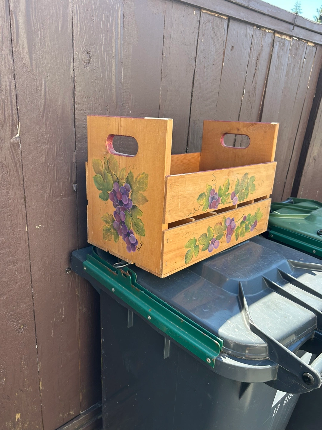 Selling a charming wooden wine bottle crate, hand-painted with a lovely grape design. It's perfect for storing your favourite wines or adding a rustic touch to your home decor. It has a few signs of wear but is still in good condition and ready for a new home
