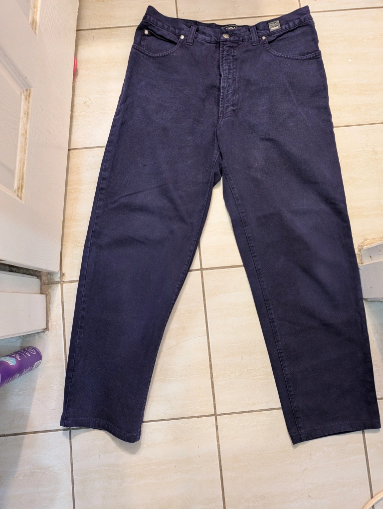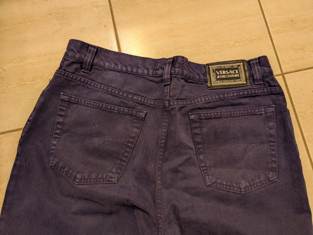 Selling a pair of Versace Jeans Couture pants! They are a stylish dark blue colour and feature the iconic Versace logo on the back patch and button. These jeans are in good condition and ready for a new home