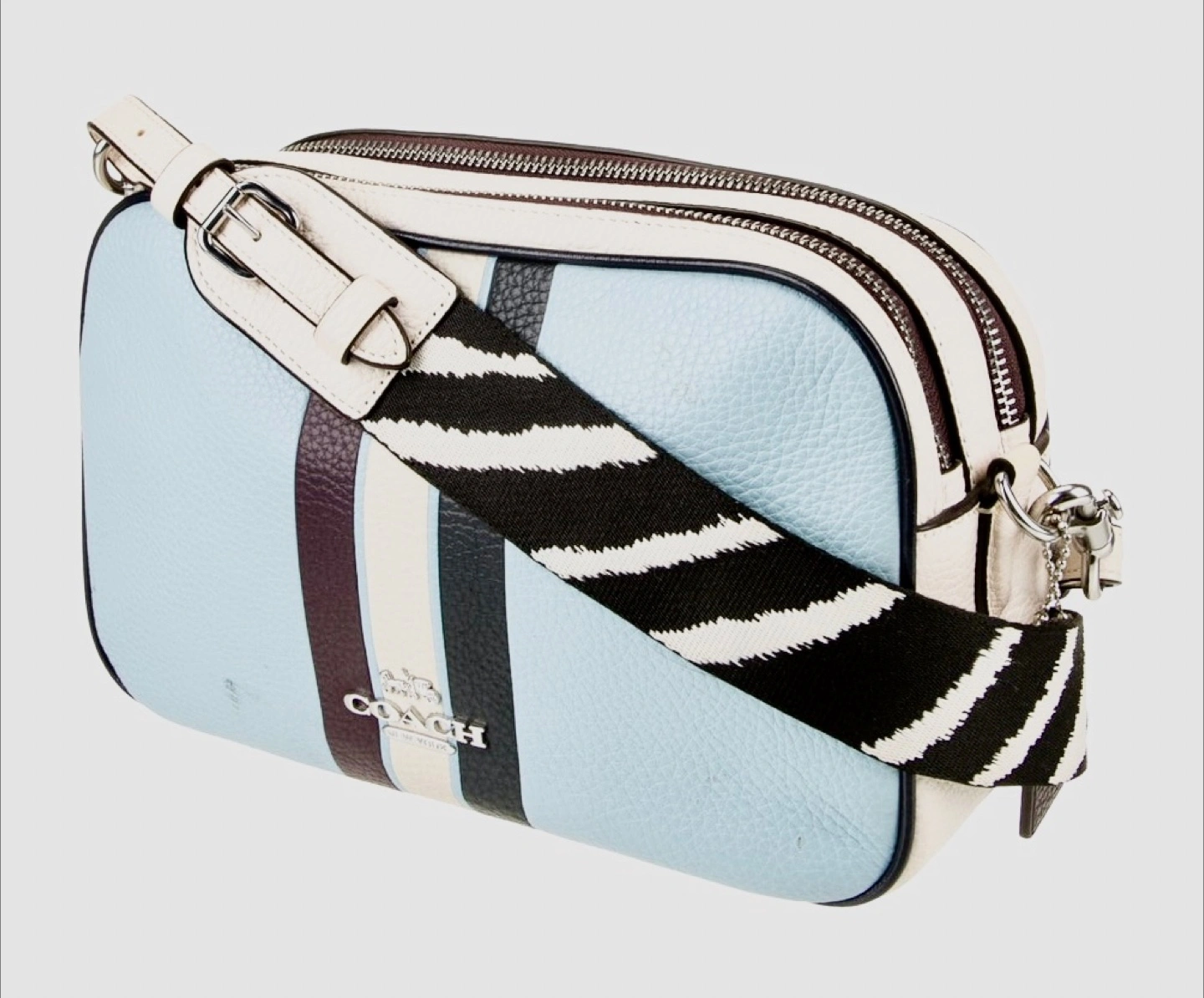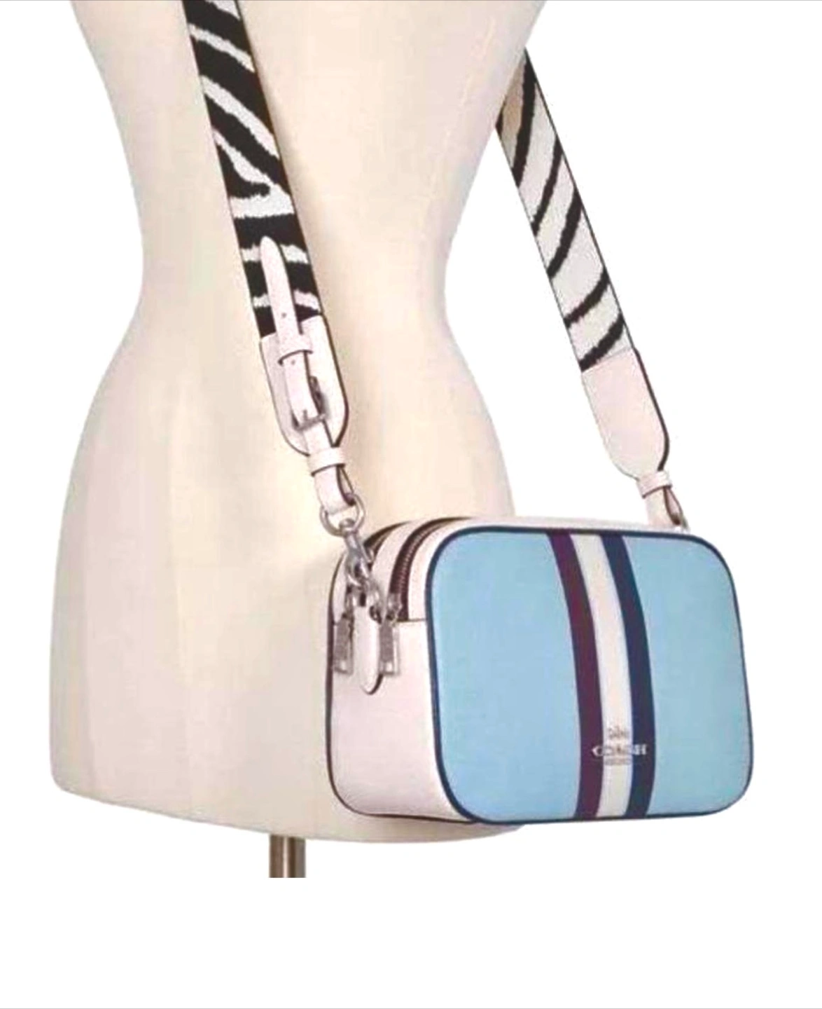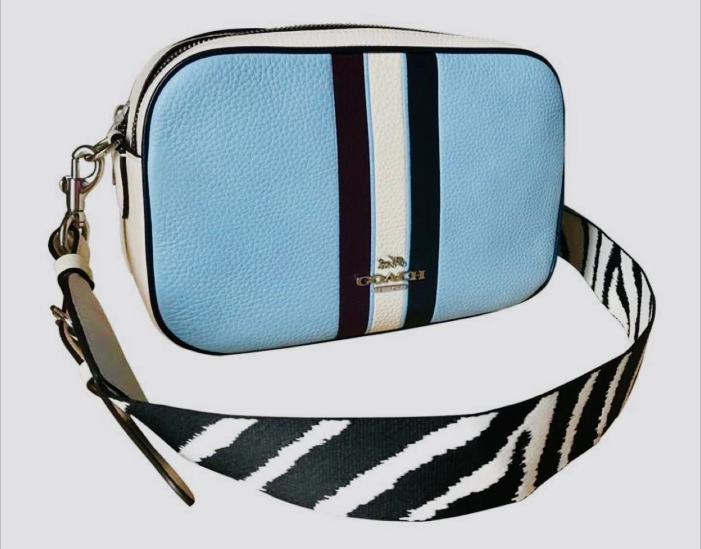 New style Coach crossbody bag in sky blue. Features bold striped design and adjustable strap.