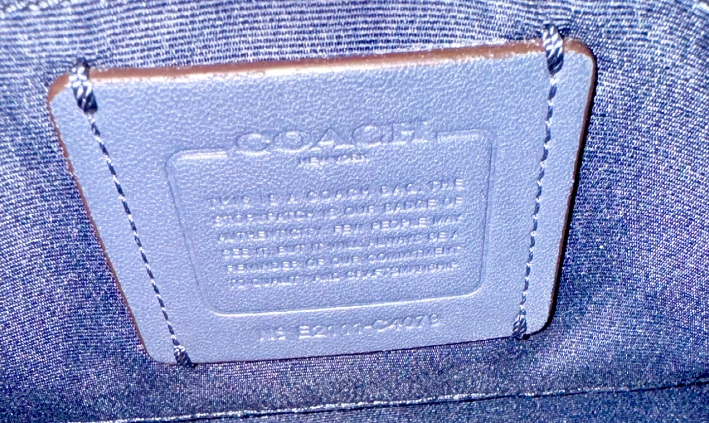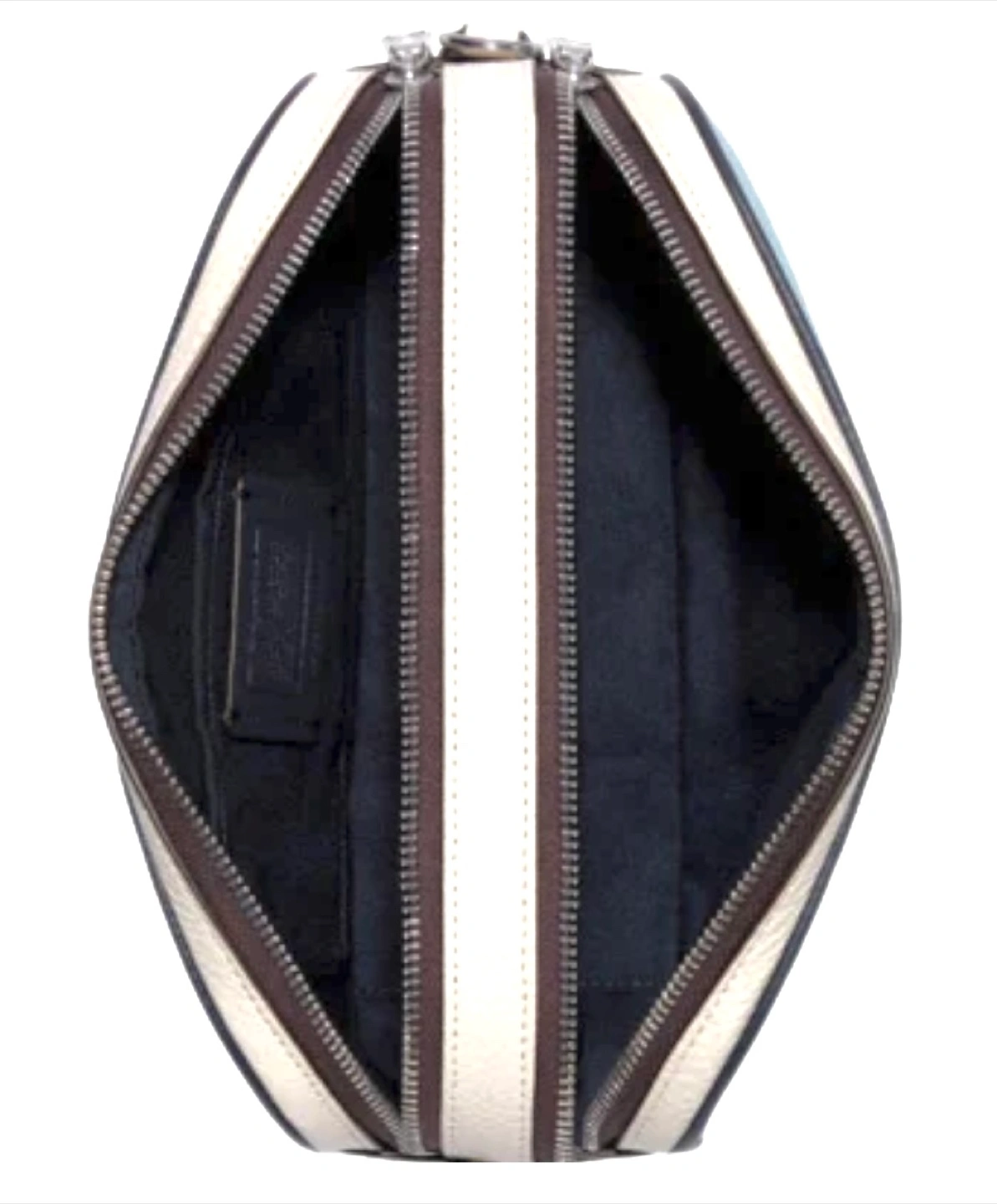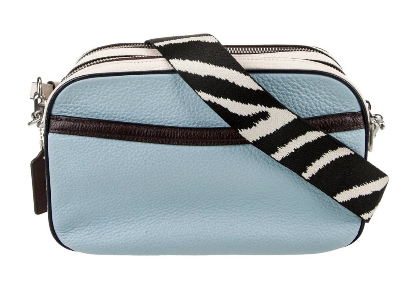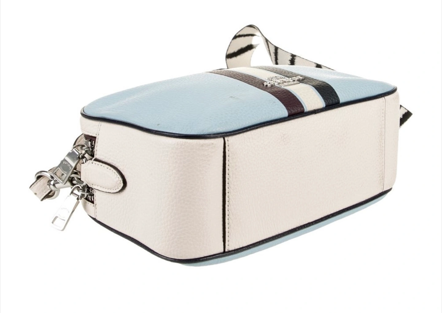 New style Coach crossbody bag in sky blue. Features bold striped design and adjustable strap.
