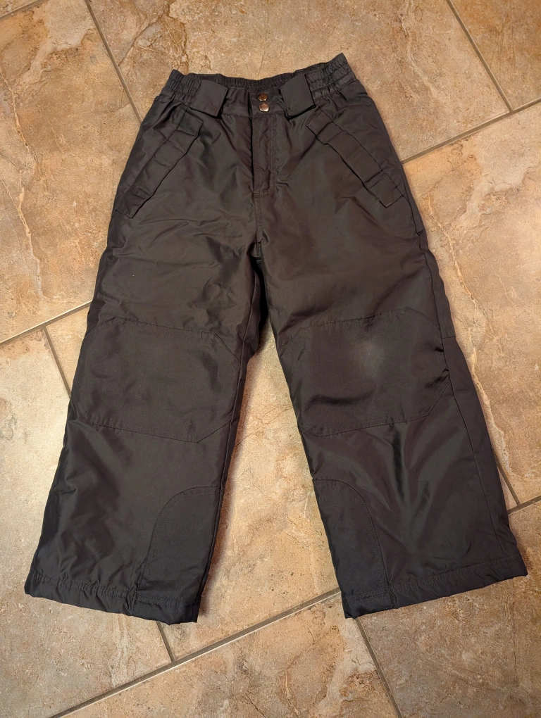 Kid's black waterproof ski/snow pants with front pockets and zipper and snap closure in very good condition. Size 6