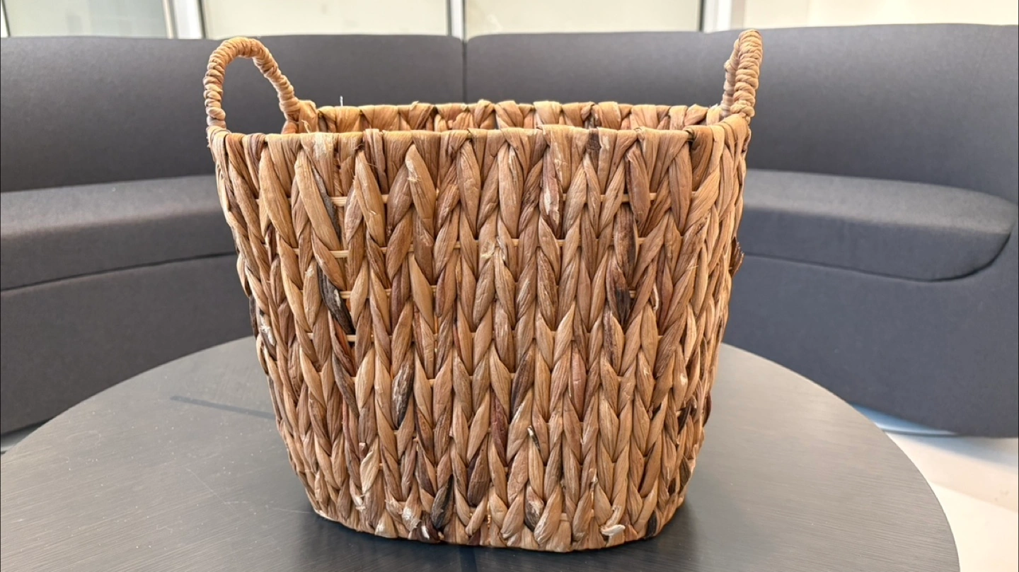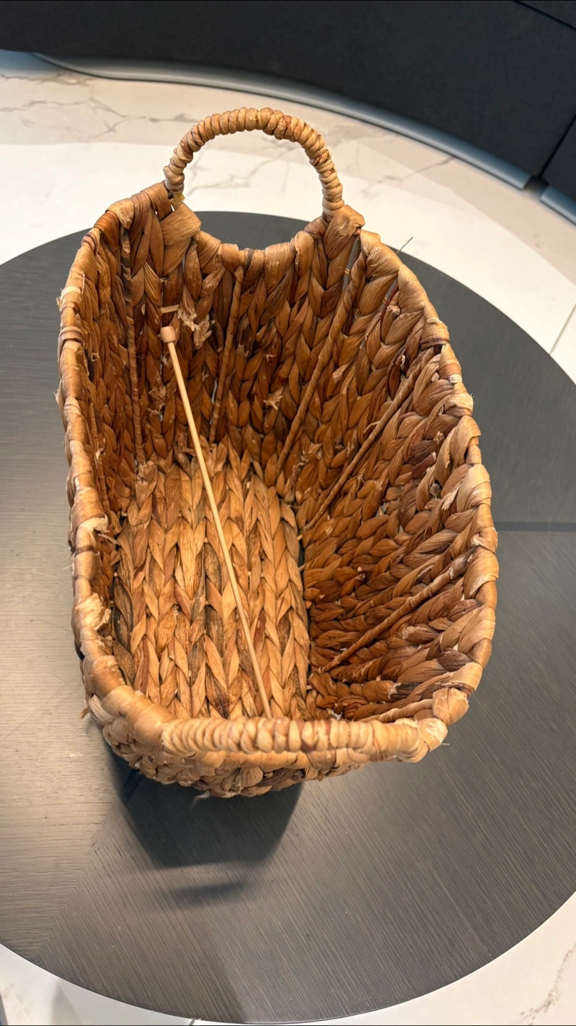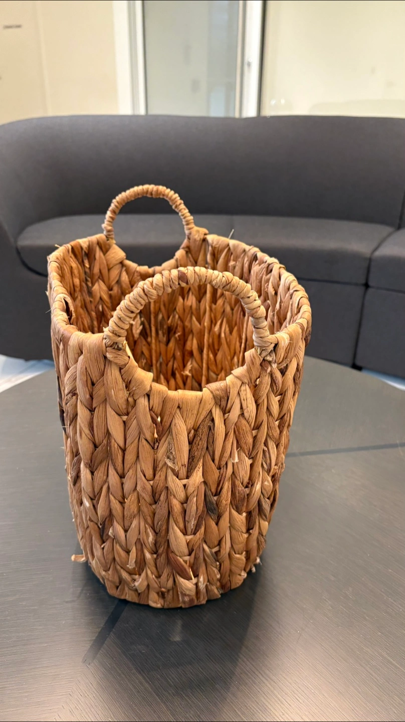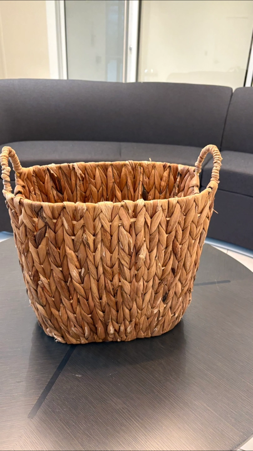 Selling a woven basket with handles. It's perfect for storage or as a decorative piece. It's in great condition and ready for a new home