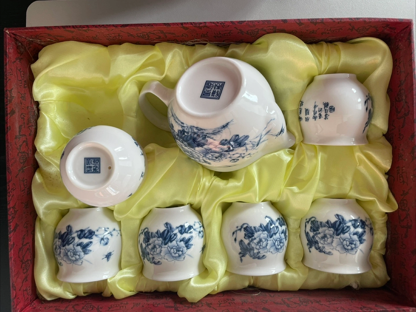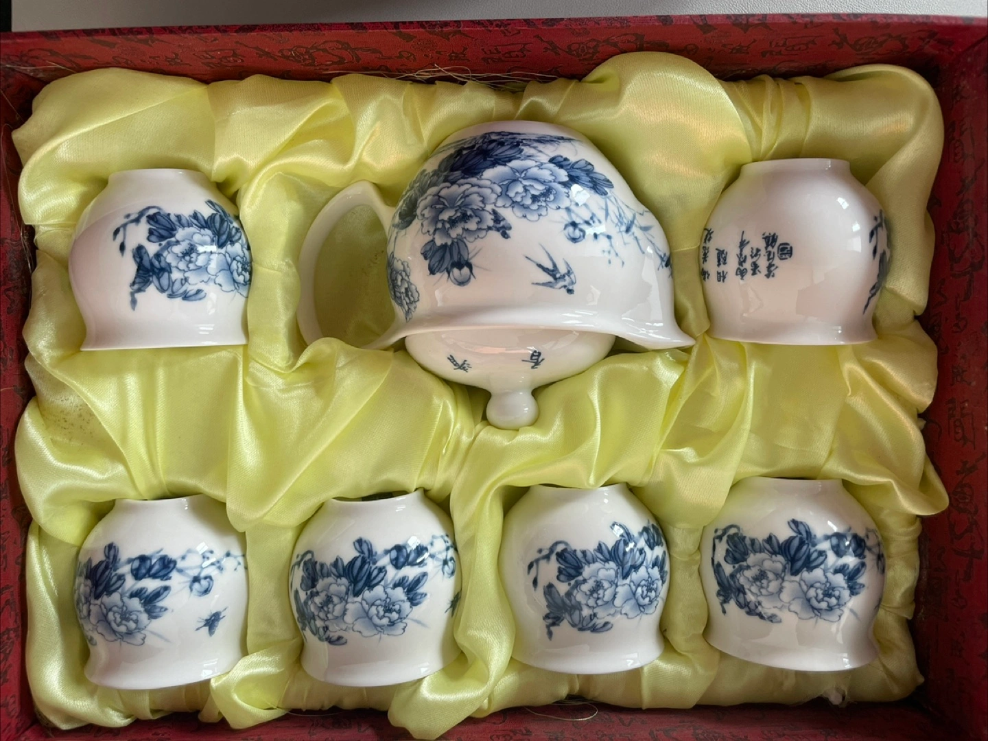 Selling a beautiful tea set with a teapot and six cups. The set features a delicate blue and white floral design. The set is in excellent condition, it’s never been used. It’s looking for a home where it will be enjoyed!