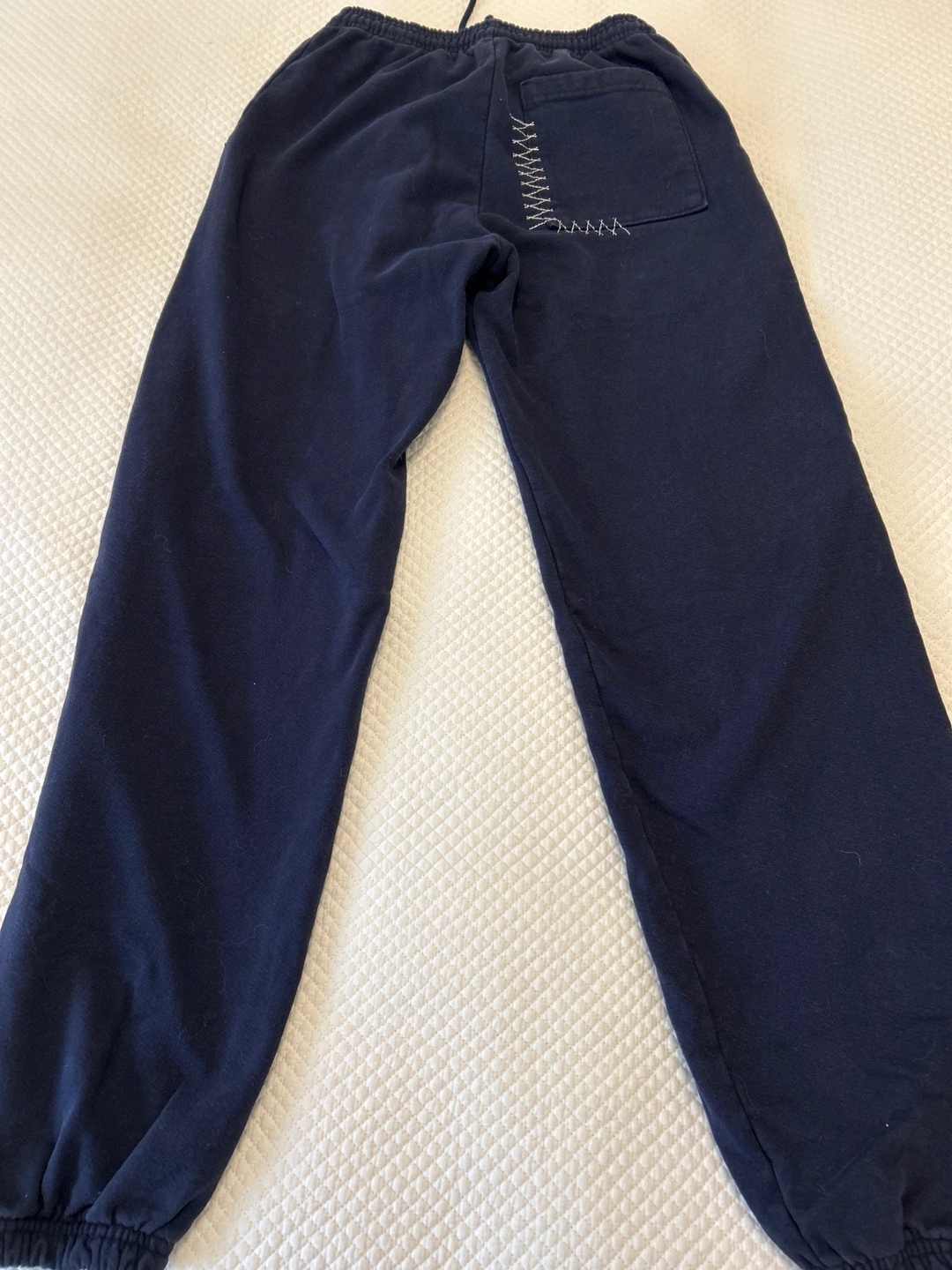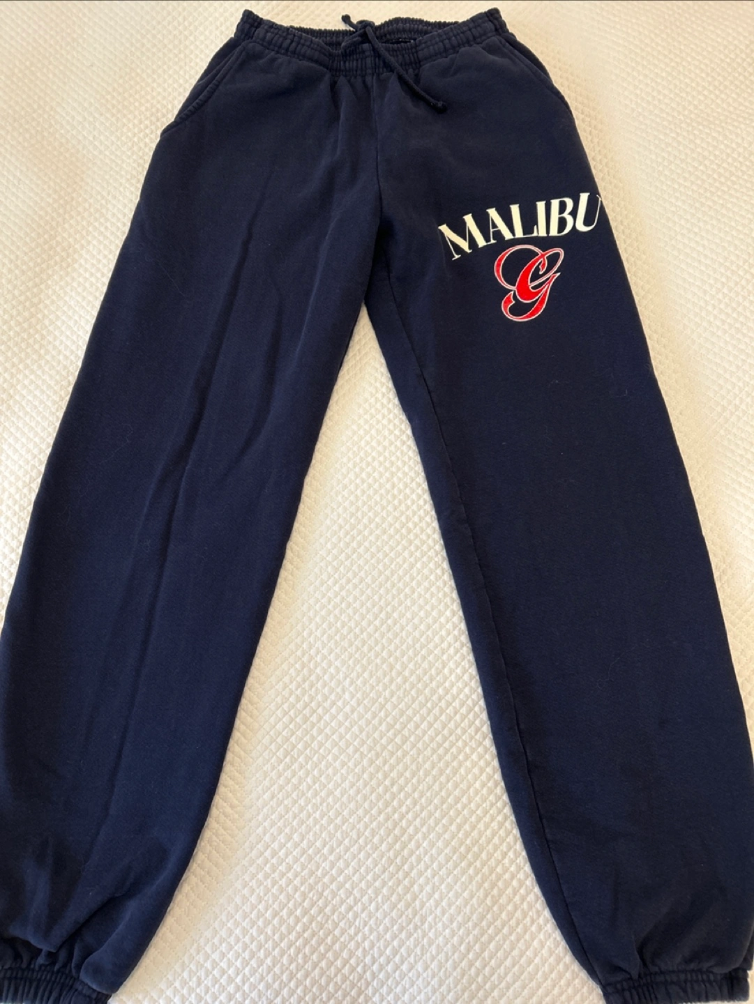 246Cozy Singillo sweatpants in a navy blue colour! They feature a Malibu design on the front. Size XS and in good condition. There is a stitched repair on the back pocket. Fits like a small. Inseam: 29”
