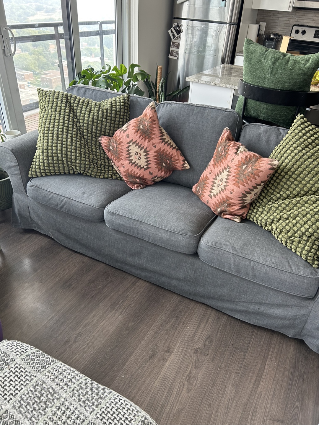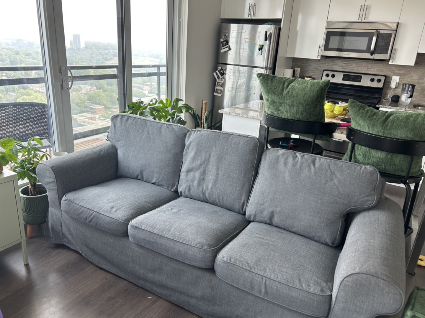 Selling an IKEA UPPLAND sofa in Hakebo dark gray! It's a comfy three-seater that's perfect for any living room. It's in great shape, with some minor wear and tear and ready for a new home.