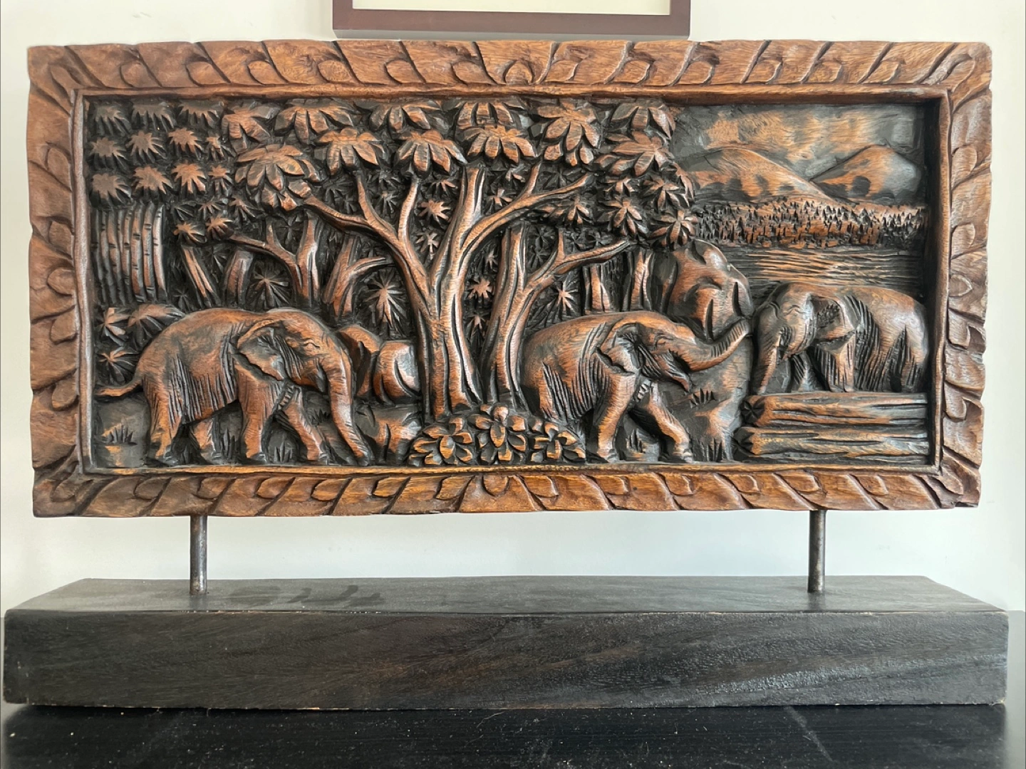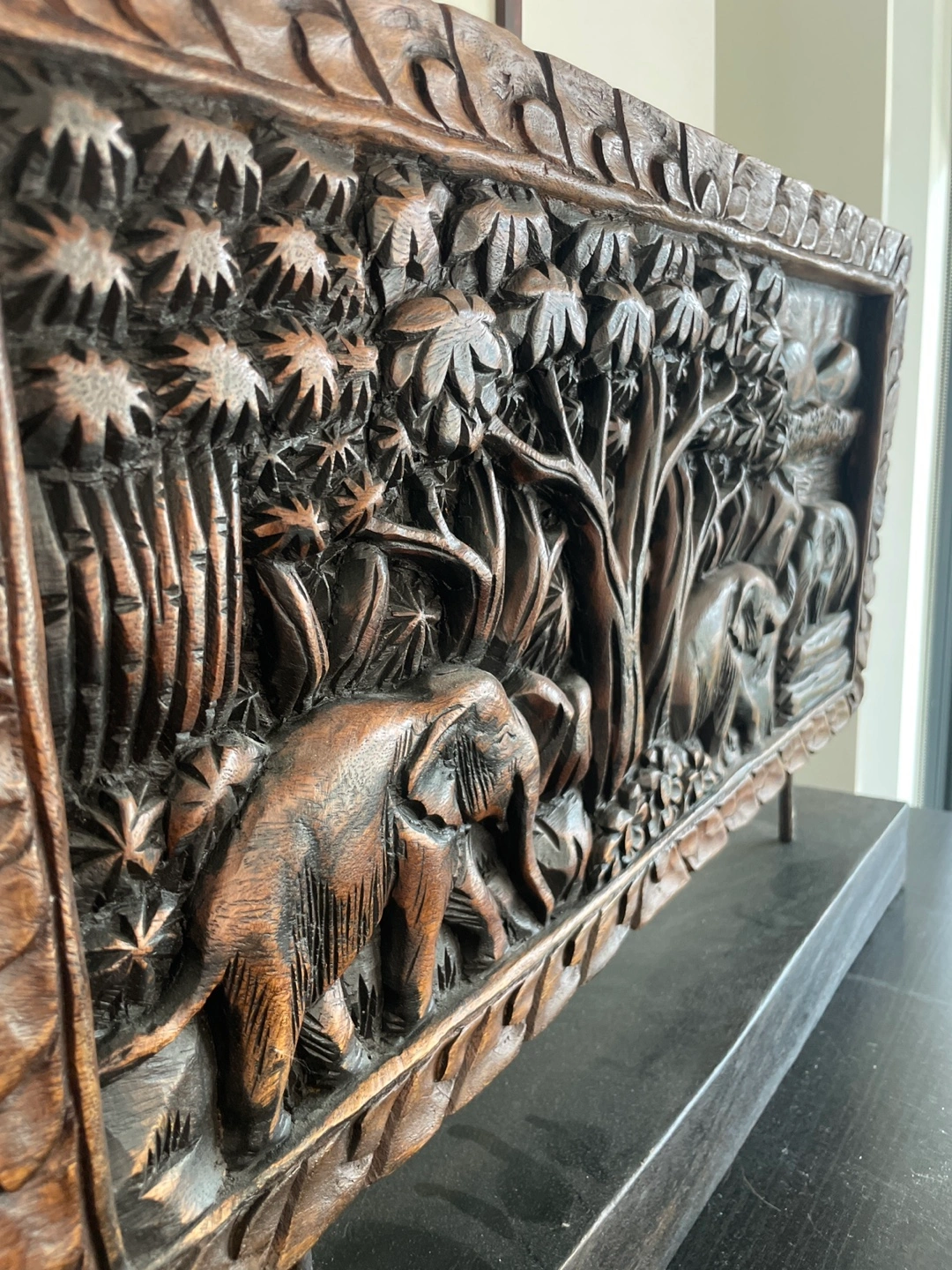 Beautiful wooden carving featuring elephants in a forest scene. Intricate details and a lovely addition to any home decor.