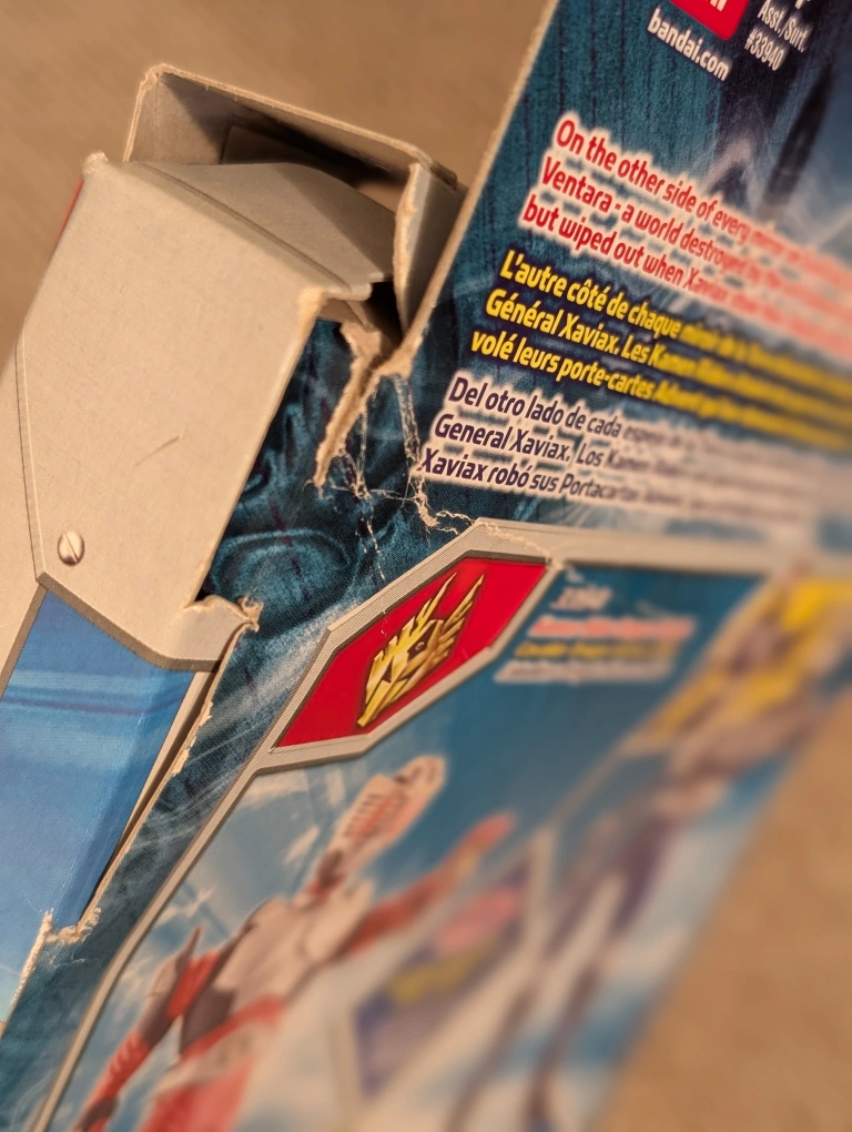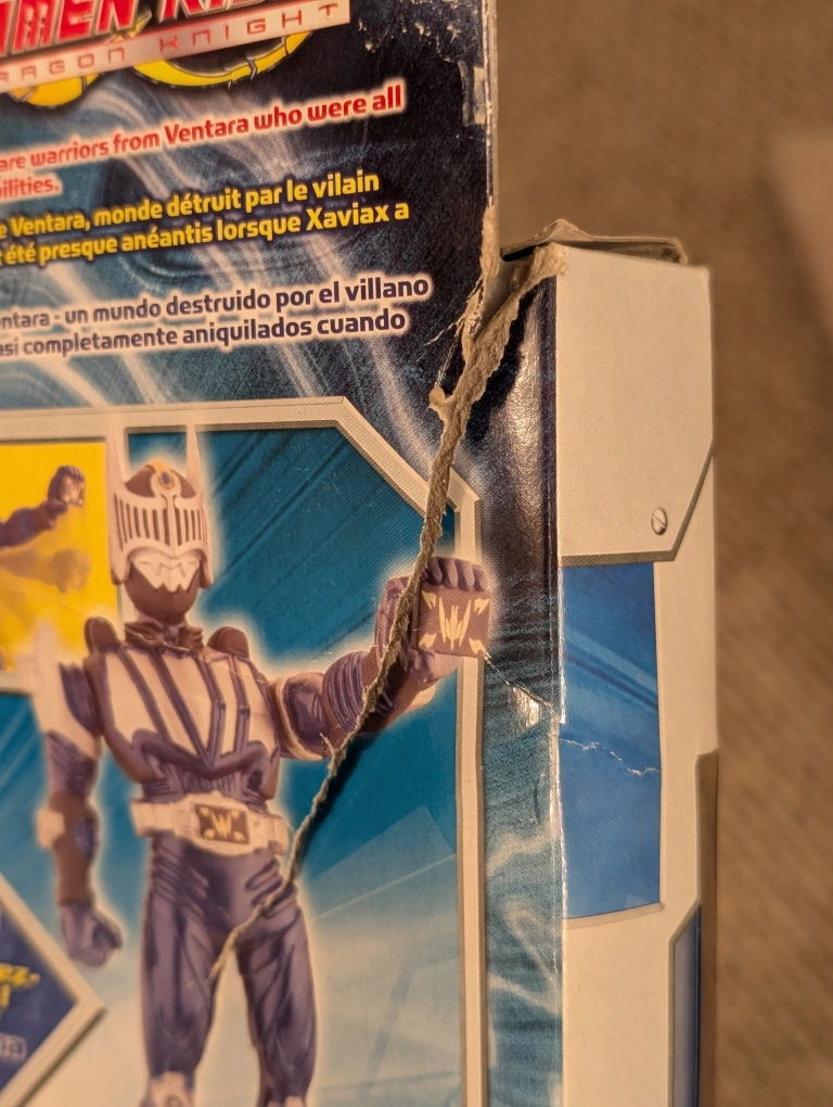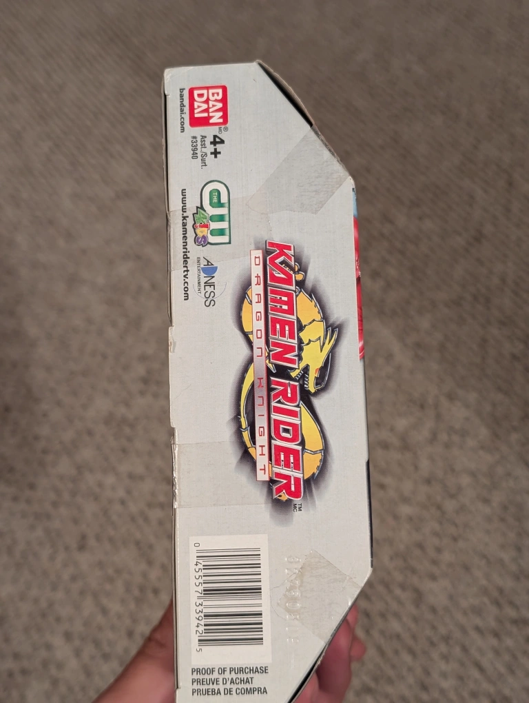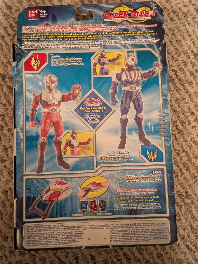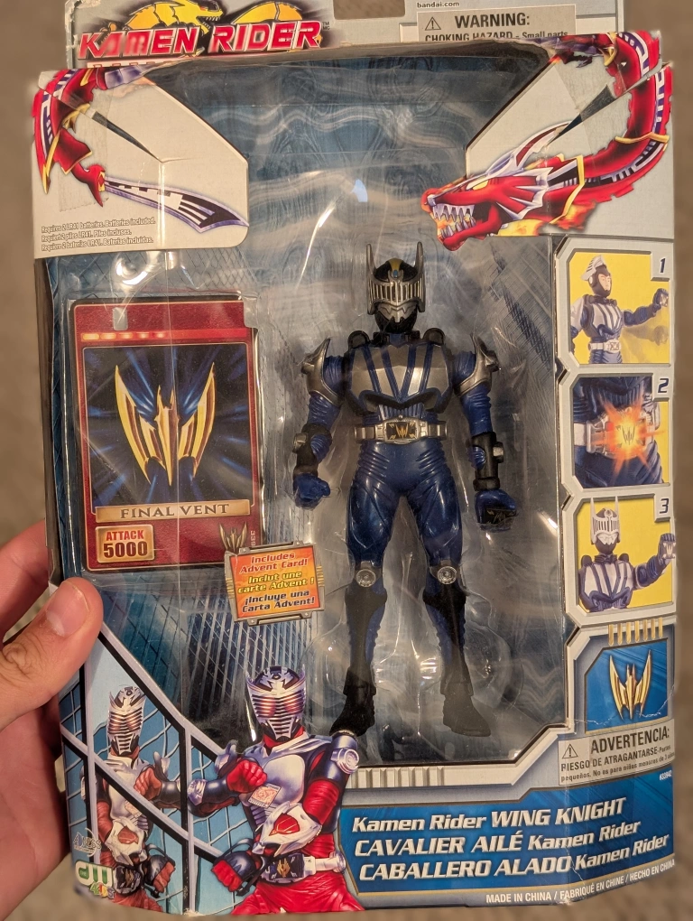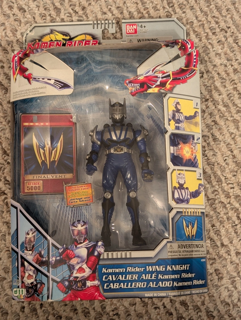 Selling a Kamen Rider Wing Knight action figure! The box has some wear and tear, but the figure inside is in great condition. It's a cool collectible for any fan of the series