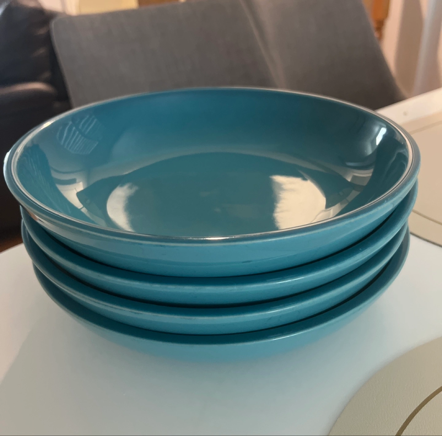Selling a set of four Le Creuset pasta bowls in a beautiful teal colour. These bowls are perfect for serving pasta, salads, or any dish you like! They are in great condition and ready for a new home