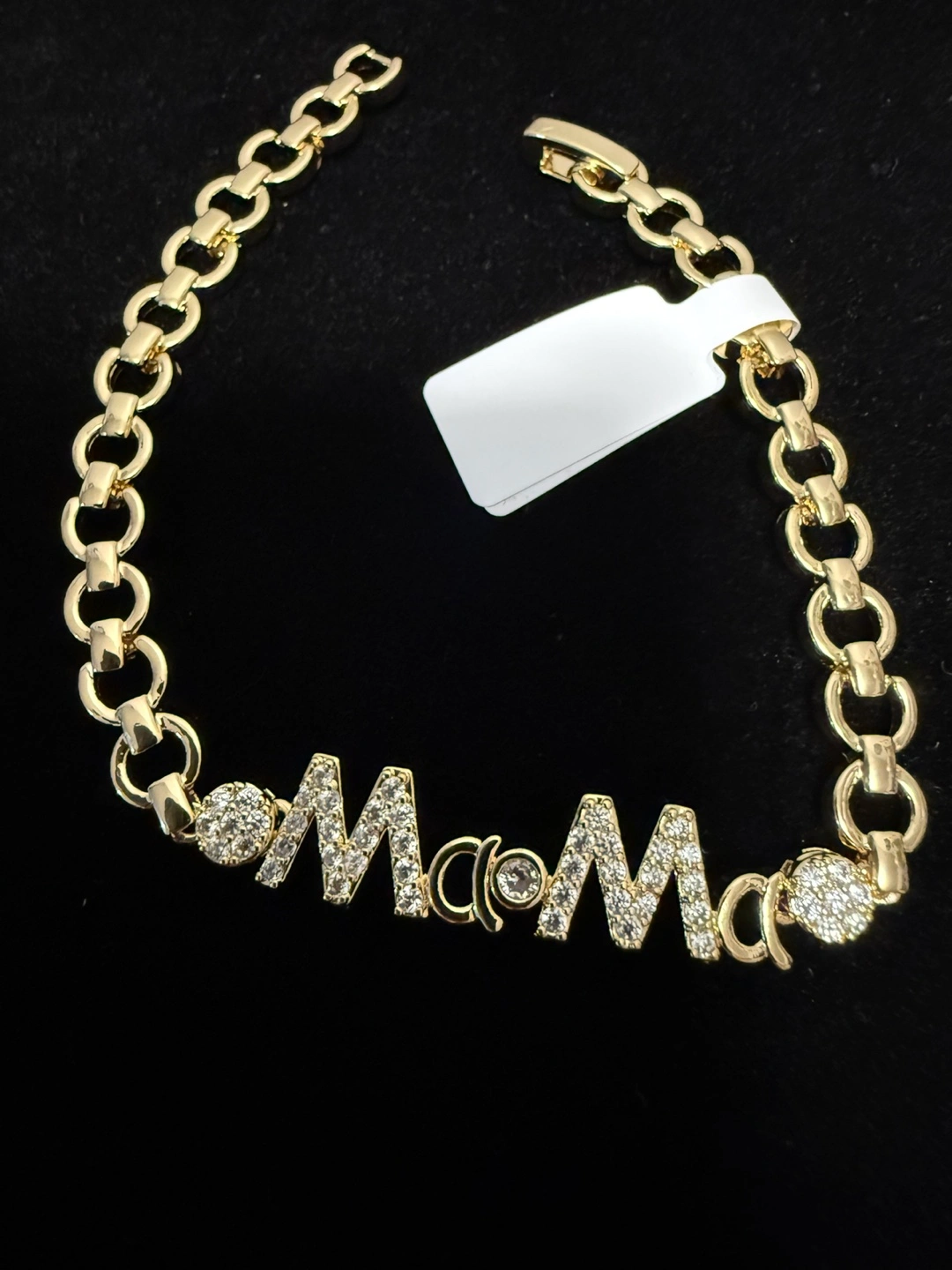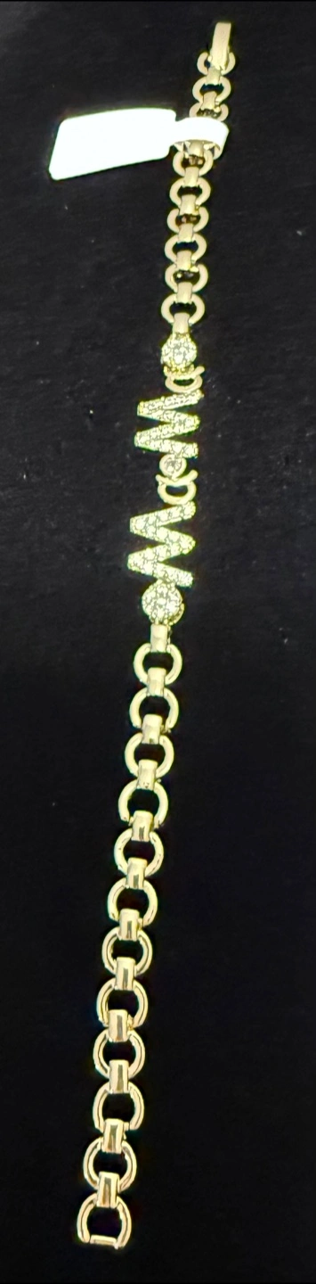 Selling a gold-colored bracelet that spells out 'MaMa'. It has some sparkly accents with cubic zirconia stones. It’s 18k Gold Fill.